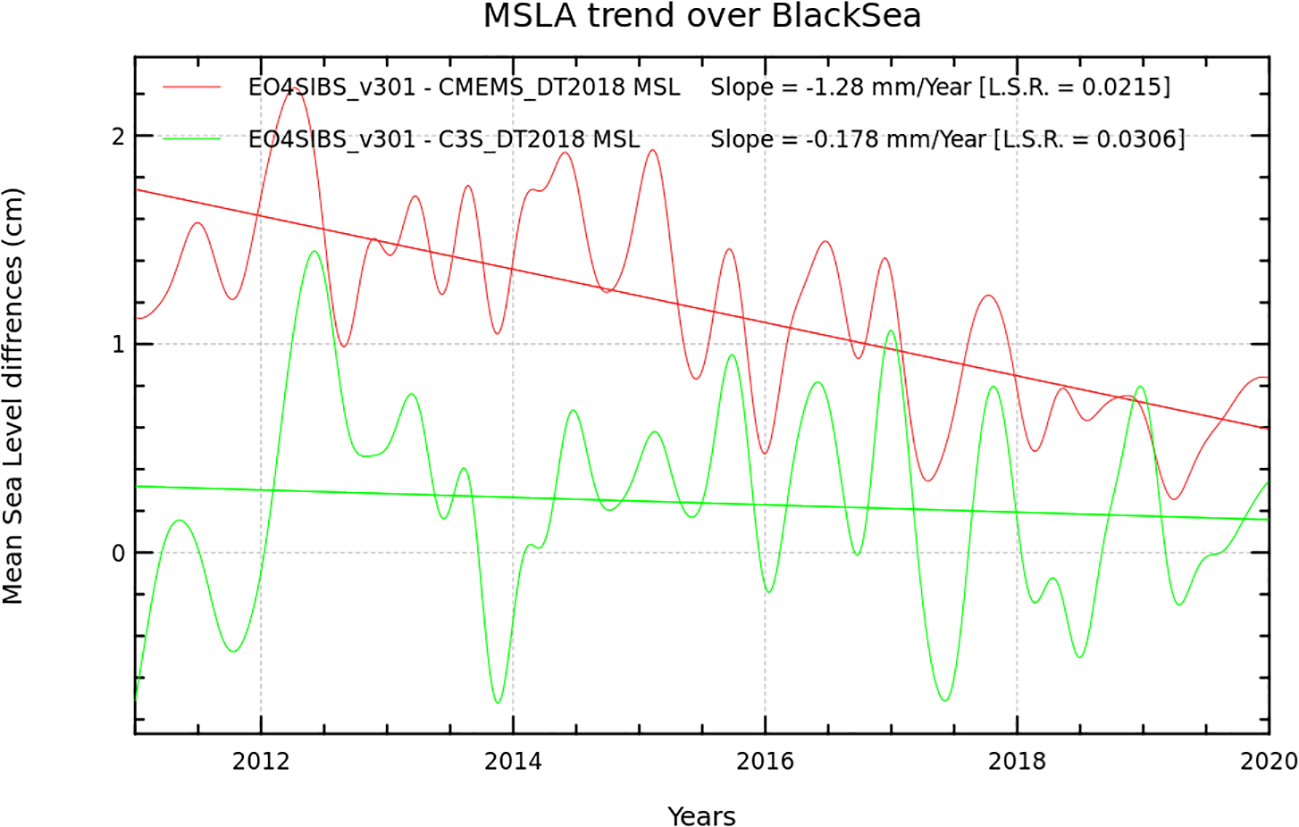 The monitoring of the long-term evolution of the Mean Sea Level (MSL) for climate applications and the analysis of Ocean/Climate indicators (e.g., MSL trends) require a homogeneous and stable sea level record. Such a dataset is produced within the Copernicus Climate Service (C3S, Legeais and Meyssignac, 2021), which is considered as the reference product for MSL change detection. Trend in the MSL estimated from C3S is compared with that estimated with products from the Copernicus Marine Service and EO4SIBS (Figure 12). These last two products are more designed for mesoscale activities. The MSL trend is analyzed over the 10-year period common to the 3 products considered. Although a 10-year period is too short to give an accurate estimation of the MSL climate trend over the Black Sea, it allows to qualify the consistency of the different gridded products. The 10-year trend in the MSL obtained from these 3 gridded products show important differences with -0.11 ± 0.35 mm yr-1 for EO4SIBS, 0.07 ± 0.36 mm yr-1 for C3S and 1.17 ± 0.35 mm yr-1 for Copernicus Marine Service. The EO4SIBS MSL trend presents large (-0.178 mm yr-1) and very large (-1.28 mm yr-1) differences with trends obtained from C3S and Copernicus Marine Service regional reference products, respectively. Analyses suggest that a good part of these differences arises from the choice of the Mean Sea Surface (MSS) solution used in the processing. While C3S use the same gridded MSS reference for the processing of all the altimeter measurement used for this product, Copernicus Marine Service production rather considers Mean Profile (i.e., a MSS estimated along the track of the altimeter) for repetitive altimeter measurements (e.g., Jason-3 and Sentinel-3A over the period considered). The long wavelength pattern difference between these two MSS solutions can affect the stability of the MSL trend over regional areas such as the Black Sea as discussed in the C3S product quality document. Additionally, possible residual biases between SAR and LRM mode acquisition areas for C2 may also contribute to the MSL trend differences. Further analyses are however required to quantify this effect. Nevertheless, the better consistency of the MSL trend deduced from EO4SIBS products and reference two-satellite C3S products suggests an improvement compared to the CMEMS production. The use of higher frequency upstream data may have enhanced cross-calibration correction in the EO4SIBS multi-satellite processing.
