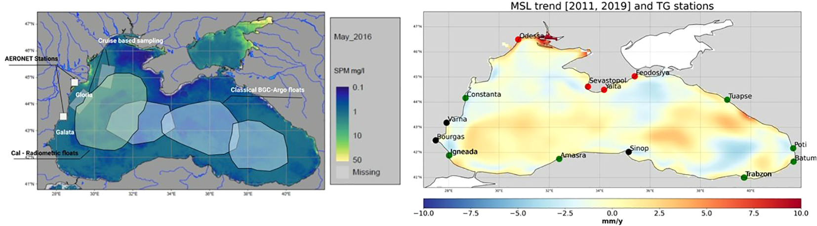 The Black Sea configuration and environmental characteristics challenge the development of earth observation products from space and require the development of specific data treatments. Its moderate size and almost enclosed character make that a large fraction of the basin influenced by the coast. From the satellite data processing point of view the measurements can be strongly degraded by land-sea contamination that may induce strong biases close to the coast and affect the quality of signal corrections (Oguz and Ediger, 2006; Olmedo et al., 2021; Pujol et al., 2022). Black Sea waters are optically complex, merging large amounts of Colour Dissolved Organic Matter (CDOM) (Organelli et al., 2017) and other optically active organic and mineral Suspended Particulate Matter (SPM) delivered by its large rivers. Several regional algorithms have been developed for Chl-a (e.g., Kopelevich et al., 2002; Volpe et al., 2007; Kajiyama et al., 2018) while for SPM and Turbidity (TURB), only products obtained with global algorithms are available in operational mode. Previous endeavours related to calibration of a regional turbidity algorithm in the Danube Delta coastal area (Constantin et al., 2016) focused on MODIS imagery. As concerns Sea Surface Salinity (SSS), so far, there is no dedicated satellite-sea surface salinity (SSS) product in the Black Sea. In this paper, we present new algorithms and products developed in the frame of the 2-year ESA project EO4SIBS (Earth Observation for Science and Innovation in the Black Sea). During EO4SIBS, Ocean Colour (OC), altimetry and SSS products are produced by improving and developing algorithms and data processing to appropriately tackle the Black Sea’s particular configuration and geophysical characteristics. These products are developed for the last decade and are validated with regional datasets. They are developed aiming at better characterizing the Black Sea mesoscale and coastal processes, basin scale productivity and SSS.
