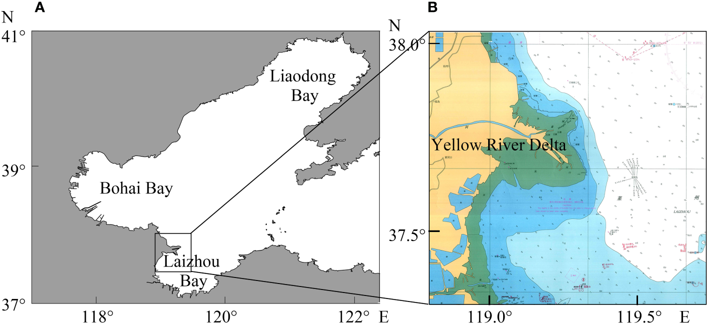 The topographic map of Bohai (A) and water depth in the main study area of Yellow River Delta (B).