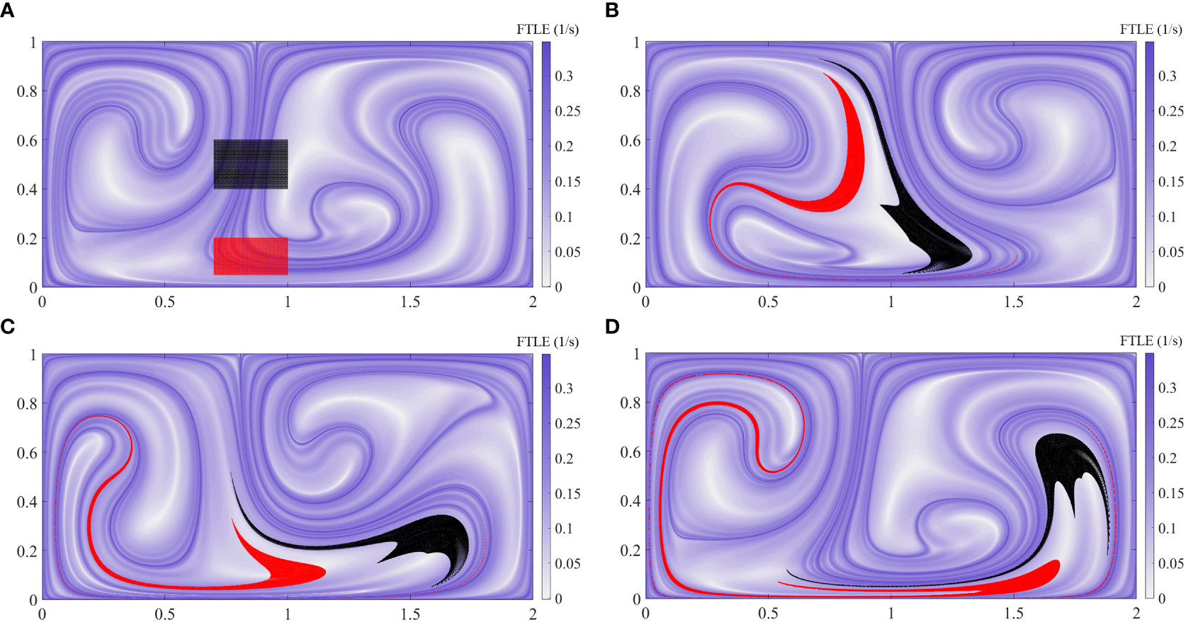 Since the instantaneous distribution of the buoyant material approximates the attracting material curves, which are related to the backward FTLE, we compared the distribution obtained from particle tracking with aLCSs. The particles are released from the red and black areas at t = 0 (Figure 3A). The particle distributions at t = 16 s, 18 s, and 20 s are shown in Figures 3B-D superimposed on the aLCSs at the corresponding times. The particles accumulate on both sides of the banded aLCSs. This indicates that the aLCSs actually act as barriers in the material transport process, making the material unevenly distributed. LCS provides a powerful method for describing transport phenomena that are not revealed by instantaneous measurements.
