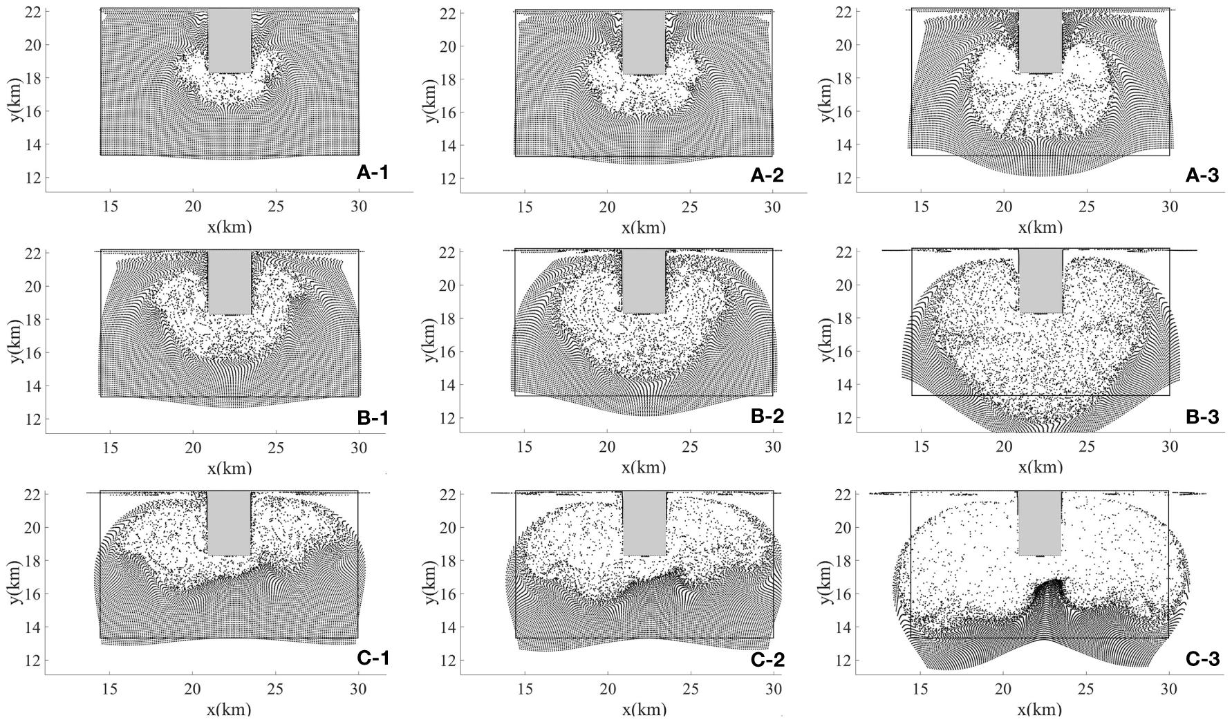 Particle distribution after t = 60 h (A-1, B-1, C-1), 120 h (A-2, B-2, C-2), 360 h (A-3, B-3, C-3) Under the action of three different flow velocities V0 = 0.1 m/s (A), 0.3 m/s (B), and 0.5 m/s (C),. The box with black lines is the initial release area of the particles.
