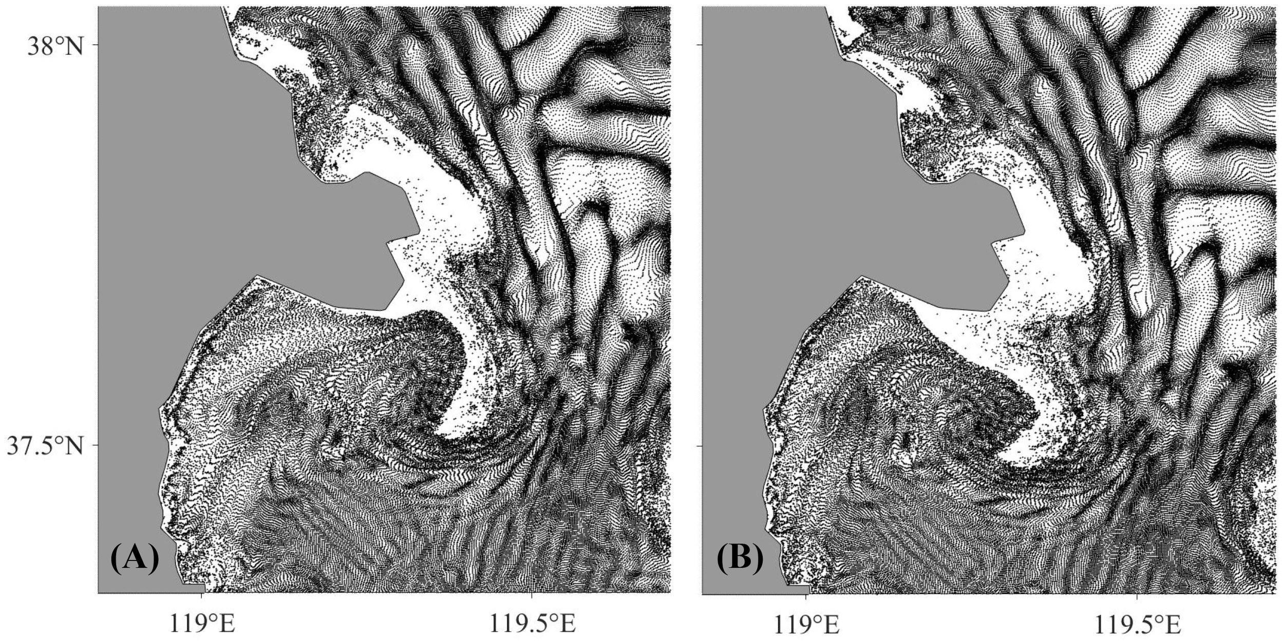 The LCSs can be obtained by extracting the FTLE edge based on Formula (2), which is easily identified from the FTLE field by intuitive observation without complex LCS extraction techniques. Figure 7 shows the backward FTLE field over a 200-hour time interval, in which (A) corresponds to particles released at low tide and (B) corresponds to particles released at high tide. The two FTLE distributions are nearly consistent, suggesting that the FTLE is a more stable Lagrangian variable than either the single particle trajectory or the LRC.
