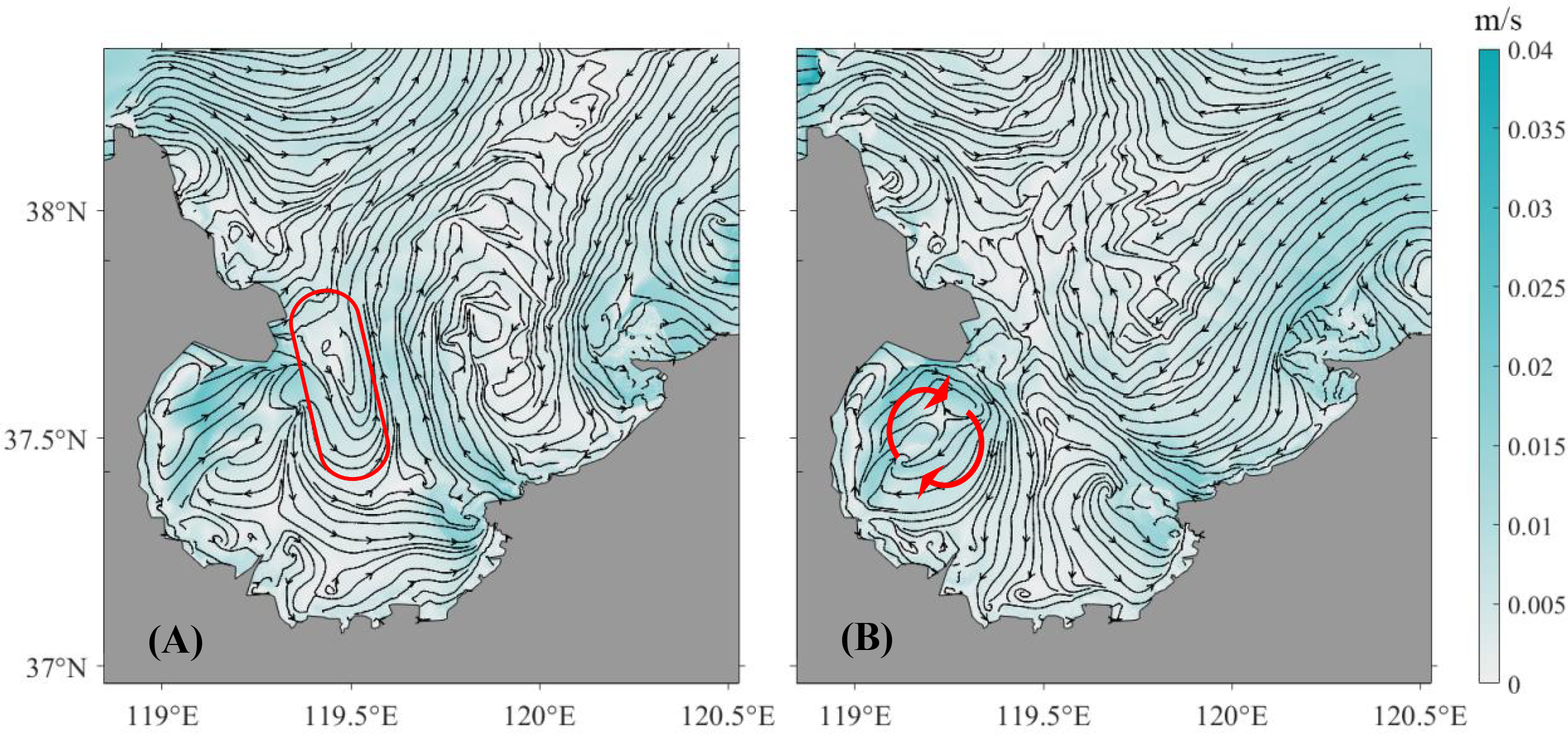 In this article, LRC is calculated by the numerical method-based Equation (3). When the particles are released at high tide, there is a clockwise LRC vortex to the south of the headland (red arrows in Figure 6B). This is consistent with the conclusion of Wang et al. (2015). If the particles are released at low tide, there is a tongue-like LRC (red box in Figure 6A).