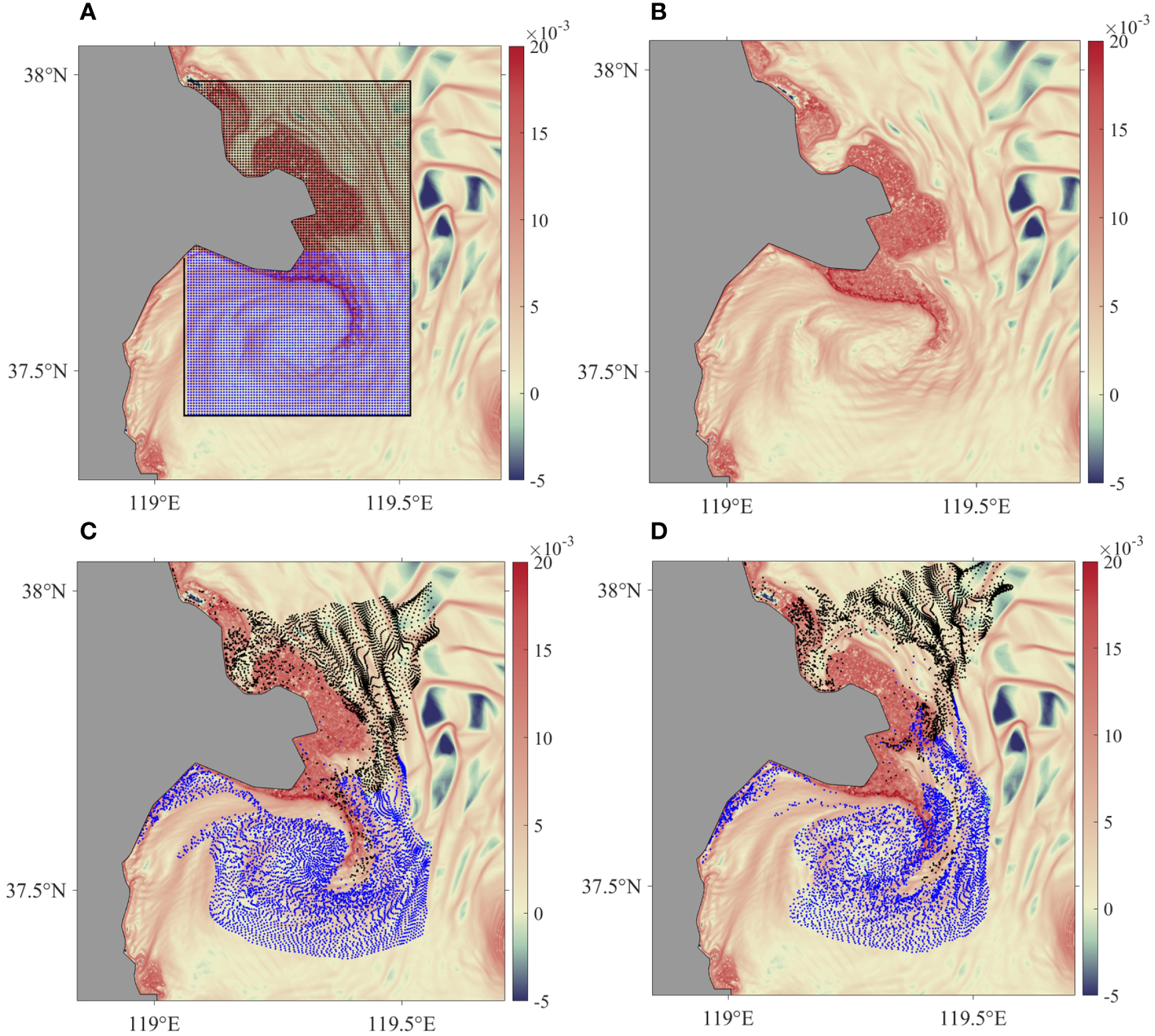 The headland is known to influence coastal flows and the movement of suspended materials along the shoreline (George et al., 2018). Flow around coastal topography such as headlands typically involves strong wakes with vigorous recirculation after shoreline separation (O’Byrne et al., 2007). These dynamical structures impact the physics of coastal systems and play an important role in biological, ecological, and geological processes (Magaldi et al., 2008). Much work has been done to study the effect of headlands through field experiments and numerical simulations (Alaee et al., 2004; Dong and McWilliams, 2007). Because of the significant ecological, social, cultural, and economic value of the headlands, it is more meaningful to study their impact on the estuary. In this paper, we focus on the headland in the Yellow River Estuary (YRE). We will reveal the effect of the headland on material transport, which is important to understand material distribution, such as pollutants, plankton, pelagic fish eggs, and larvae. The study results can provide a reference for the selection of key monitoring areas and sampling stations for water quality. Also, it is necessary to improve the management and design of marine protected areas (MPAs).