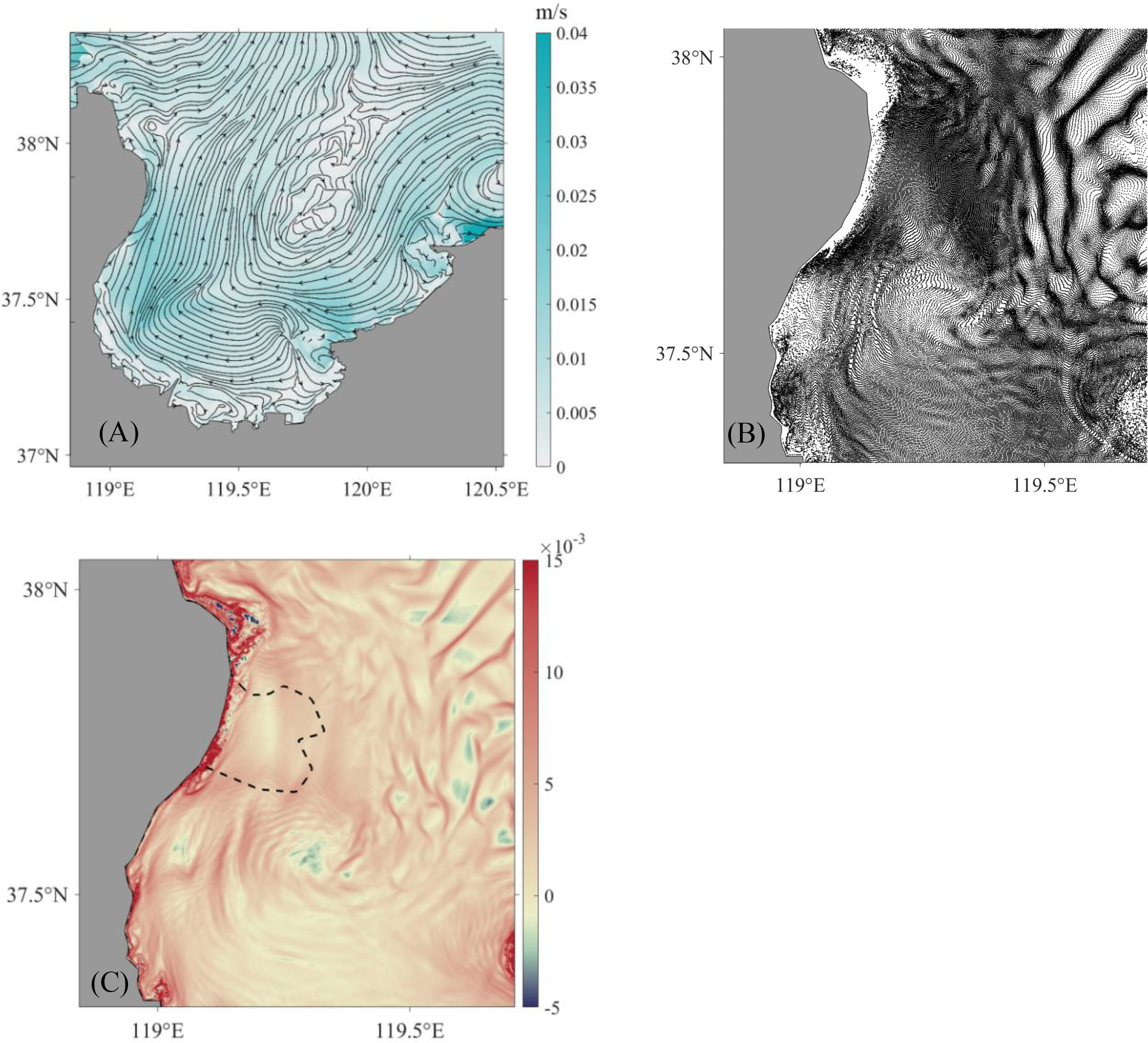 The Lagrangian residual current (A), particle distribution after 300 h (B), and backward FTLE field for 200 h (C) obtained from the model after adjusting the coastline at the time are consistent with the high tide in Figures 5–7.