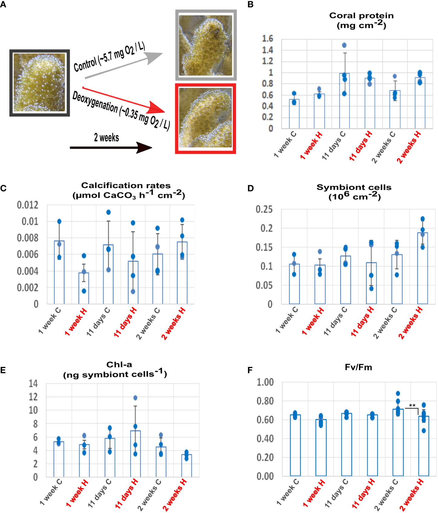 The morphology and physiology of the coral and its symbionts showed high tolerance to the prolonged deoxygenation. All the coral fragments survived two weeks of severe deoxygenation conditions, without apparent morphological changes (Figure 1A). After one week of deoxygenation, coral protein amount was unaffected by treatment (n=3 for 1 week; n=4 for 11 days and for 2 weeks p=0.063) (Figure 1B). Coral calcification rates showed a trend of reduction that was not significant (n=3 for 1 week; n=4 for 11 days and for 2 weeks, p =0.295), resuming control levels after two weeks (Figure 1C). Symbiont numbers showed a trend of increase after two weeks of deoxygenation that was not significant (n=3 for 1 week; n=4 for 11 days and for 2 weeks, p =0.277) (Figure 1D). The chlorophyll-a content per symbiont cell showed a trend of decrease after two weeks of deoxygenation that was not significant (n=3 for 1 week; n=4 for 11 days and for 2 weeks p=0.174) (Figure 1E). The photochemical efficiency (Fv/Fm) of the symbionts decreased by 4% after two weeks of deoxygenation. Although this decrease was statistically significant (n=12 for 1 week and 11 days; n=9 for 2 weeks p= 0.0019) (Figure 1F), we cannot assume it has biological significance as decreases of 40-50% after three to five days are reported for deoxygenation stress (Johnson et al., 2021b). These results indicate that S. pistillata, the symbiont and the host-symbiont system are tolerant to a prolonged reduction in oxygen levels.