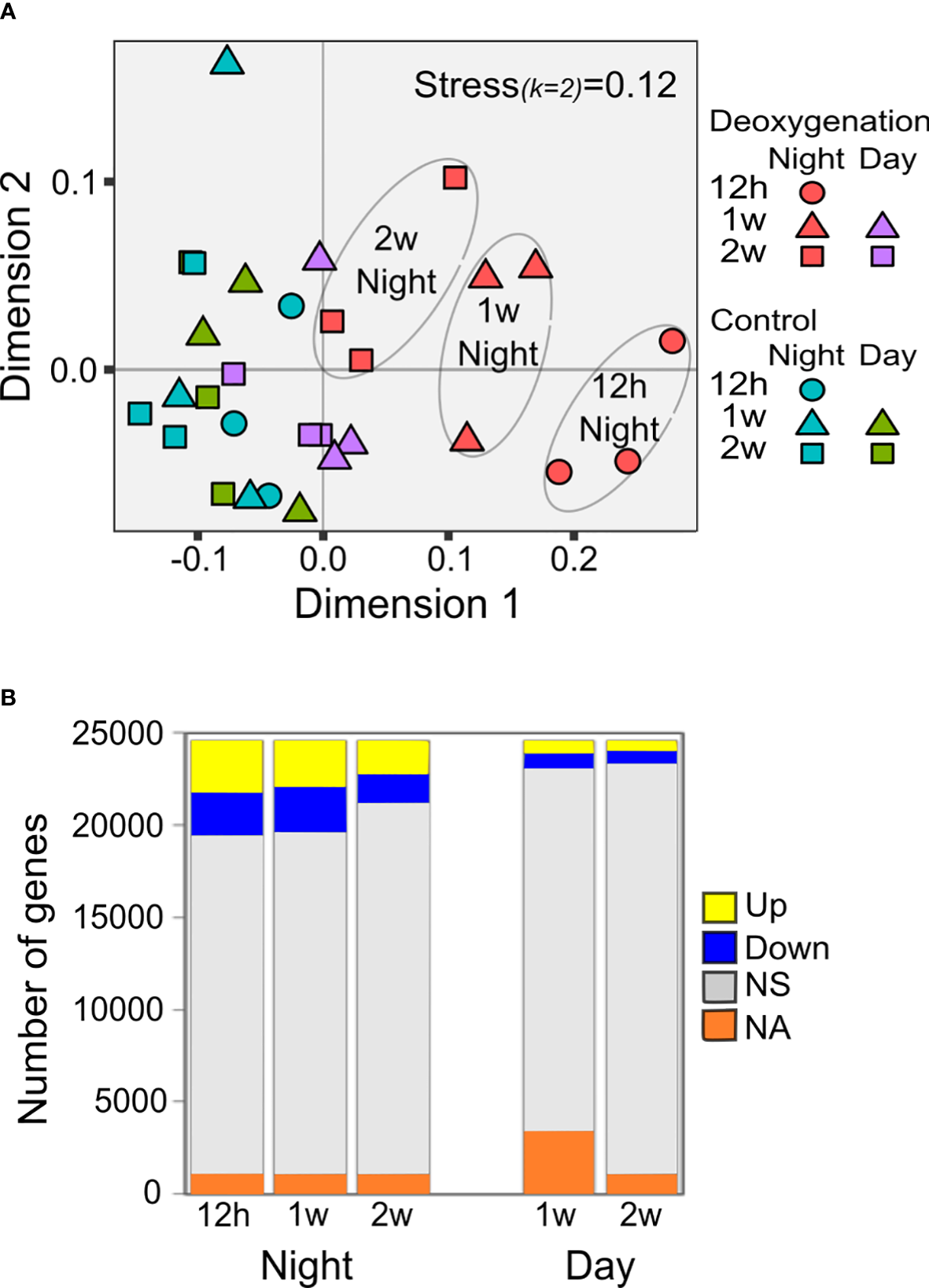 To identify the general trends of gene expression in control and deoxygenation conditions through time, we performed a non-metric multidimensional scaling (NMDS, Figure 2A). The NMDS clearly separates the samples of night deoxygenation from the rest of the samples (Figure 2A). The most distinct samples are the night-time samples from 12h and one week of deoxygenation. After two weeks of deoxygenation, two of night-time deoxygenation samples are close to the day-time deoxygenation samples, which are relatively close to the controls. These results point towards a dynamic acclimation to the deoxygenation conditions over the two weeks of the experiment. Genes that were differentially expressed (DE) under the deoxygenation treatment were identified by comparing deoxygenation to control (from here on this comparison is referred to as HvsC) at each sampling time point. Differences were considered significant for Benjamini-Hochberg adjusted P<0.05 (see Experimental procedures for details on annotations and statistics).