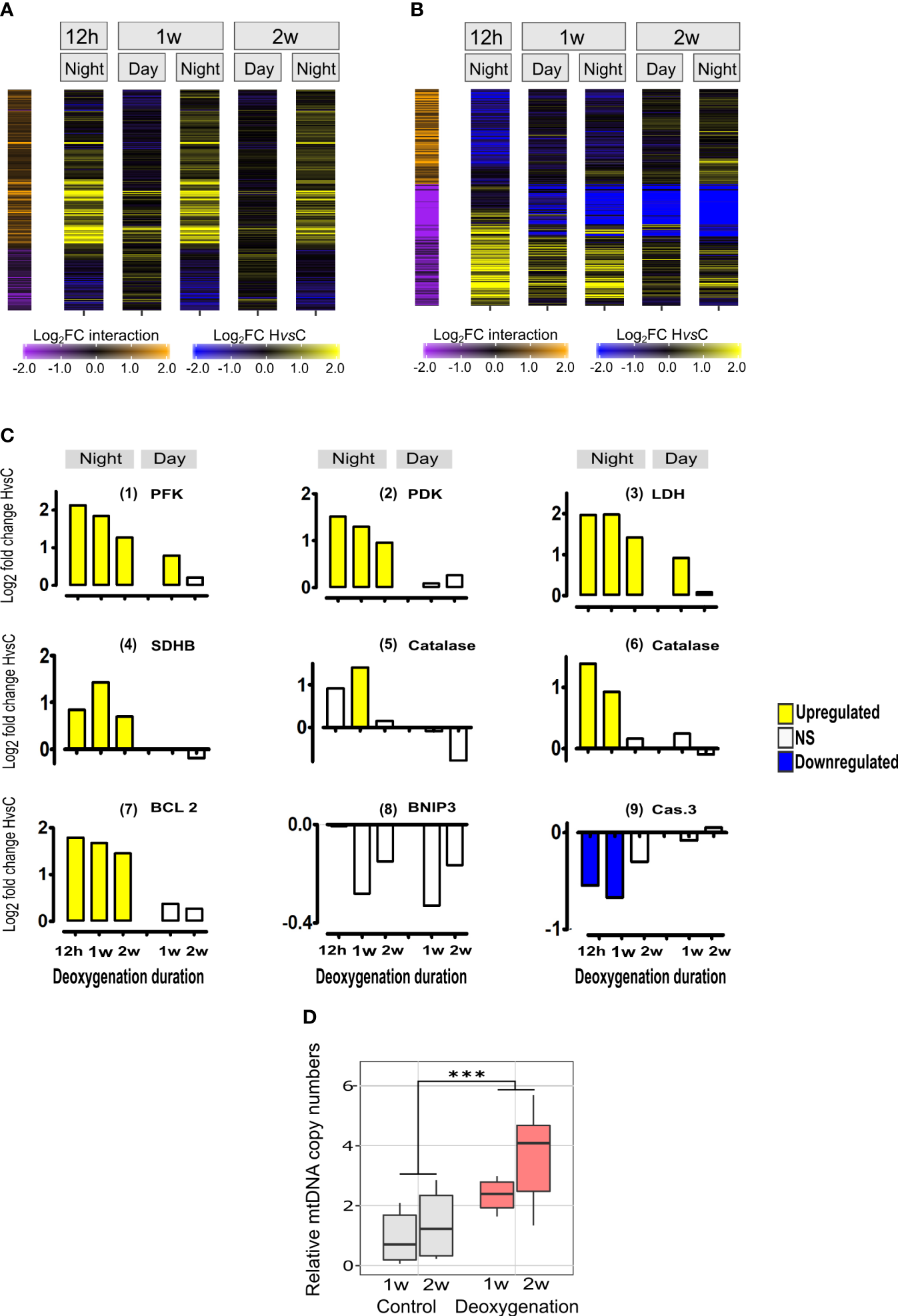 Diurnal-dependent and time-dependent changes of the transcriptional response to deoxygenation in S. pistillata and mitochondria DNA copy numbers. (A) Heatmap representing genes exhibiting diurnal-dependent changes of the intensity of response to deoxygenation. For each time point, log2 fold change of expression differences between HvsC are color-coded as blue-black-yellow gradient. Represented genes that have significant HvsC x Day vs Night interactions using DESeq2 are color-coded in orange-black-purple scale shown on the left-side of the heatmap. Interaction log2FC values are color-coded as yellow-black-blue gradient. Log2FC values lower than -2 or higher than 2 are color-coded as maximum values (Data S1 and Table 1). (B) Heatmap representing genes exhibiting time-dependent changes of the intensity of response to deoxygenation. Details are as in part A of this figure and represented genes that have significant HvsC x Time interactions using DESeq2 (Data S1 and Table 2).(C) Expression of orthologs of major genes: (1) Phosphofructokinase (PFK) (gene24349); (2) Pyruvate dehydrogenase kinase (PDK) (gene21622); (3) Lactate dehydrogenase (LDH) (gene17088);(4) Succinate dehydrogenase [ubiquinone] iron-sulfur subunit, mitochondrial (SDHB) (gene 10554); (5),(6) Catalases, (gene 3500 and gene 18116, respectively); (7) anti-apoptosis styBCL2 (Kvitt et al., 2016) (gene22055); (8); Mitopagy inducing BCL2/adenovirus E1B 19 kDa protein-interacting protein 3 (BNIP3) (gene5649); (9) executioner of apoptosis styCaspase3 (Casp3) (Kvitt et al., 2016) (gene6838). DE (p<0.05) of HvsC response is represented as Log2FoldChange. NS- not significant. (D) Quantitative analysis of mitochondrial Cox1 gene DNA normalized to nuclear Timeless gene DNA. Results are expressed in boxplots of independent DNA extractions from distinct fragments (n=10, one week; n=8, two weeks) incubated in control (grey) or subjected to deoxygenation (red) (see Figure S2B). Values were compared by the aligned rank transform test with significant effects for treatment (DF=1, F=20.6, p<0.0001). Asterisks indicate significant differences (Data S4).