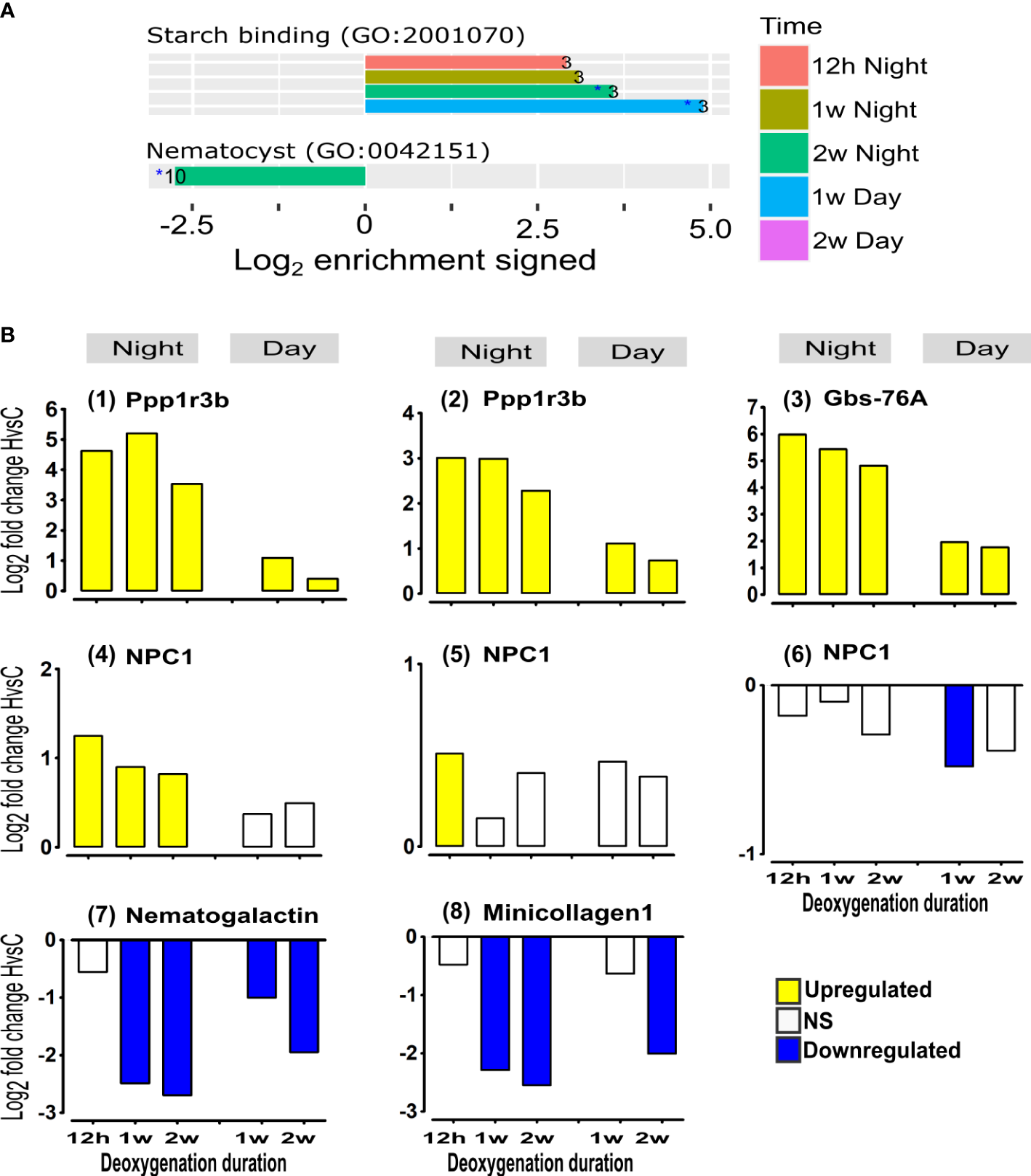 The number of genes showing significant differential expression (DE, p<0.05) in HvsC at each time point was higher at night compared to the number of DE genes during the day (Figure 2B). The number of DE genes at night decreases after two weeks (Figure 2B) in agreement with the trend shown by the NMDS results (Figure 2A). Thus, based on both NMDS and HvsC DE genes, the transcriptional response to deoxygenation was more extensive at night than during the day, and was gradually reduced with time.