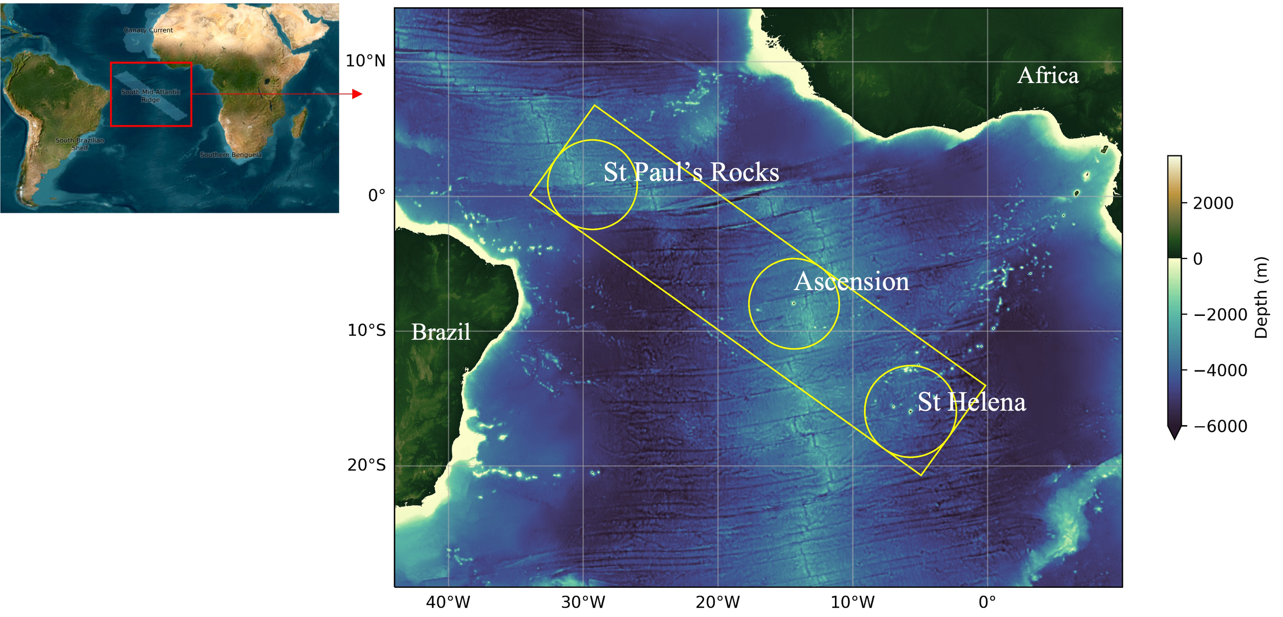 South Mid-Atlantic Ridge study area (yellow polygon). Circles indicate the EEZ of St Paul’s Rocks, Ascension Islands and St Helena.