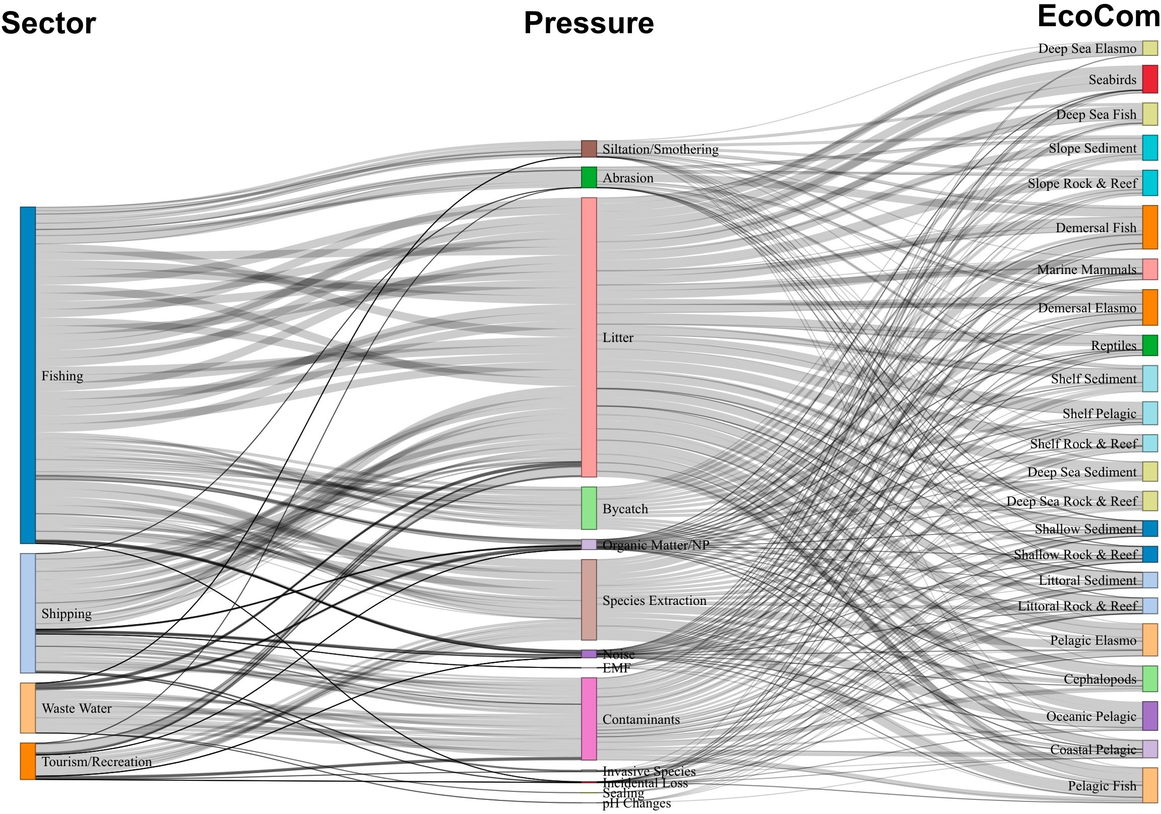 Another indicator used was ‘Proportional Connectance’ values, which is calculated as the number of impact chains (links) associated with each sector/pressure type/ecological components divided by the total number of impact chains in the ecosystem area expressed as a percentage. This indicator does not provide any indication of intensity, nor indication of which pathways may be the most critical, but how the assessed impact chains are connected (Pedreschi et al., 2019). Moreover, the Proportional Connectance is an additional index which provides a better view of the number of pressures that act on the greatest number of ecological characteristics (Pedreschi et al., 2019). Analyses were adapted from Pedreschi et al. (2019) for this study’s purposes and are available at https://github.com/gandrat/ODEMM.git.