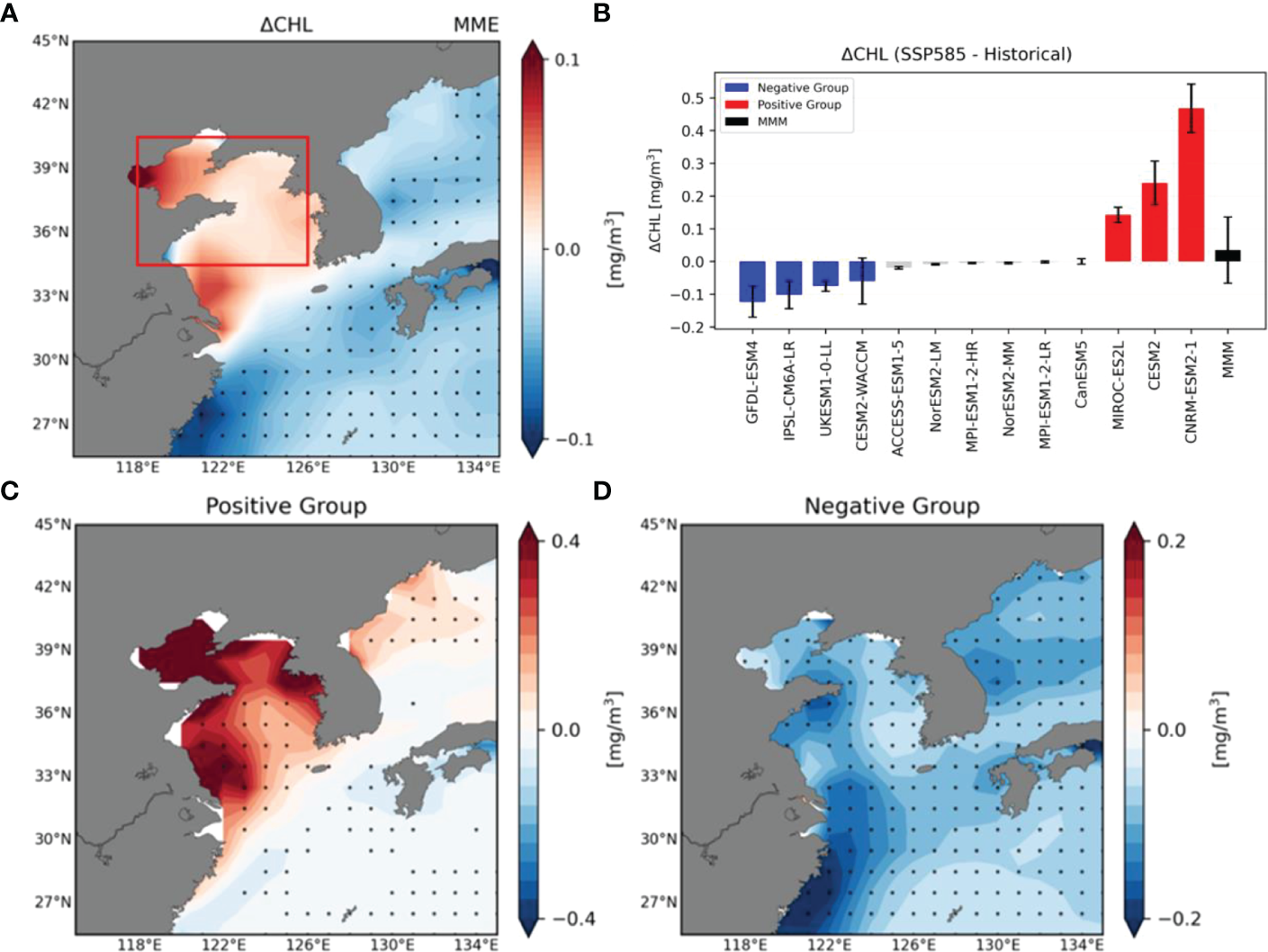 (A) Spatial distribution of Multi-Model Ensemble Mean difference in surface (upper 30 m depth mean) chlorophyll-a (SCHL) concentrations between historical climate period (1850–2014) and future climate period (2071–2100) using 13 CMIP6 models. (B) Area-averaged (Red box in Figure 1A) future changes of SCHL concentrations in the Yellow and East China Sea (YECS) region (34.5°N–40.5°N, 118°E–126°E) using 13 CMIP6 models. Red bars indicate models with an increase in SCHL concentrations in the future climate (positive group), and blue bars indicate models with decreasing SCHL concentrations (negative group). The black bar represents the Multi-Model Ensemble Mean (MMM) of 13 models of future change in the SCHL concentrations and crosses represent significance at the 95% confidence levels. (C, D) Spatial distribution of ensemble mean SCHL differences for historical and future climate periods for the positive group and negative group, respectively. Black dots indicate points at which these differences are significant at the 95% confidence level using the bootstrap method.