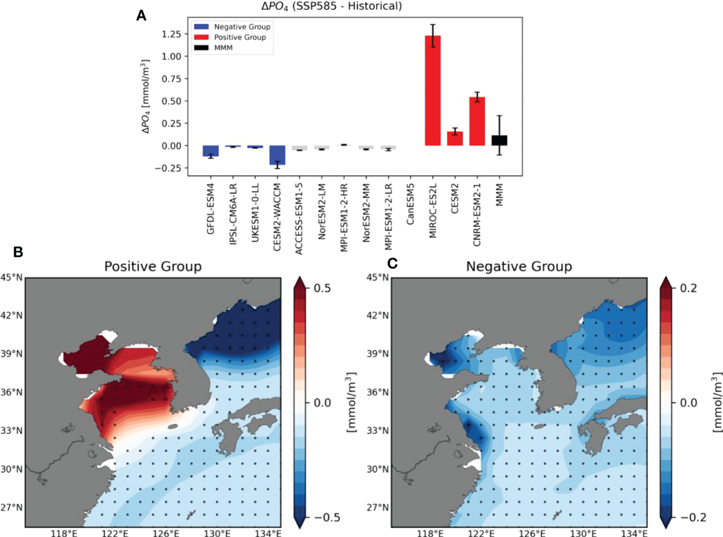 (A) Area-averaged future changes in surface (upper 30 m depth mean) Dissolved Inorganic Phosphorus (DIP) concentrations in the YECS region using 12 CMIP6 models (excluding the CanESM5 Model). The black bar represents MMM of 12 models of future change in the DIP concentrations and the crosses indicate significance at the 95% confidence level. The order of the graph is aligned the same as that of the future change of the SCHL concentration. (B, C) Spatial distribution of differences in the ensemble mean DIP concentrations of historical and future climate periods for the positive and negative Groups, respectively. Black dots indicate points at which the differences are significant at the 95% confidence level using the bootstrap method.