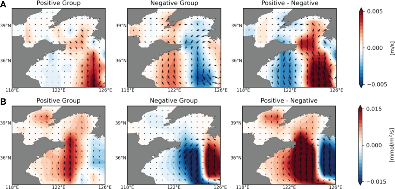 In general, the Yellow Sea Warm Current (YSWC) flows northward from the southwest of Jeju Island around the center of YS (122°E-125°E) to the northern part of the Yellow Sea and the Bohai Sea region. Chinese coastal current and West Korean coastal current flow southward on both sides (Ichikawa and Beardsley, 2002; Xu et al., 2009). The Kuroshio Current subsurface water intrudes into the YECS region as a pathway through the YSWC flows (Liu et al., 2021). In order to examine nutrient supply by oceanic currents, we calculated changes in vertically averaged (up to 100 m) ocean currents using 11 ESMs except for CanESM5 and GFDL-ESM4 which is not available for DIP data and ocean current data respectively. As shown by the ensemble mean of surface meridional ocean currents in Figure 3A, the positive group simulates strengthening the YSWC flowing northward [Left Panel]. In the case of the negative group, weakening ocean currents are simulated in the YECS region, and the Chinese coastal current and West Korean coastal current flowing southward in the surface layer is also weakened [Middle Panel]. These contrasting features result in clear differences between the two groups [Right Panel]. In other words, the positive group simulates stronger cyclonic circulation in the YECS region while the negative group simulates weaker circulation under warm climates. Furthermore, in order to identify the impact of Kuroshio Current subsurface water intrusion on the amount of P in the YECS region, we calculated PO4 transport and compared it between the two groups. The amount of PO4 transport was calculated by multiplying the DIP concentration and ocean current velocity, which was vertically integrated up to 100 m as follows: