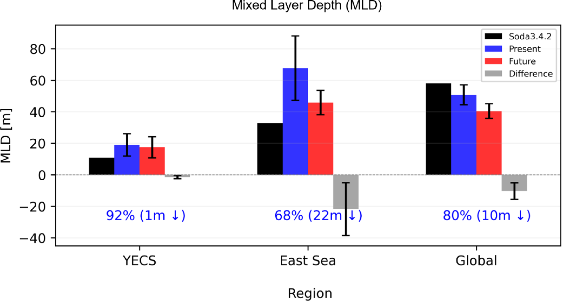 Future changes in Mixed Layer Depth (MLD) by regions (YECS, East Sea (35.5°N-44.5°N, 130°E-140°E), Global Ocean) of Multi-Model Ensemble Mean (MMM) of 13 CMIP6 models. Black bars represent the climatological MLD for 35 years from 1980 to 2015 using SODA 3.4.2 re-analysis data. Blue and red bars indicate MLD of the present and future period respectively. Gray bars represent the difference between the present and future periods. Crosses are spread over 13 models (±1std).