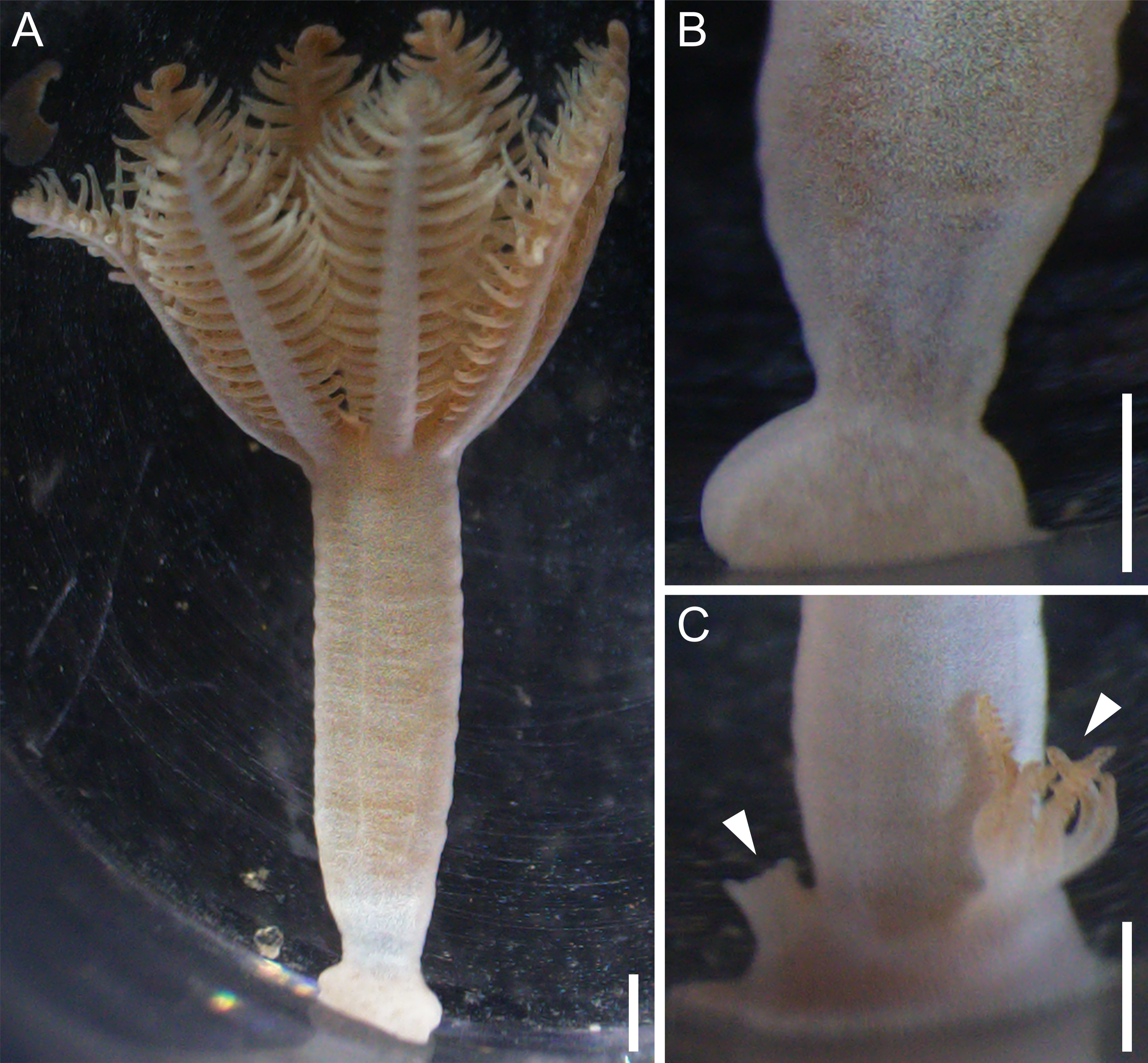 Polyp reattachment and budding in Xenia umbellata. (A) Polyp amputated from colony, reattached in tissue culture plate. (B) Close-up of basal attachment disc. (C) Daughter buds (arrowheads) forming from basal attachment disc. Scale bars 1 mm.