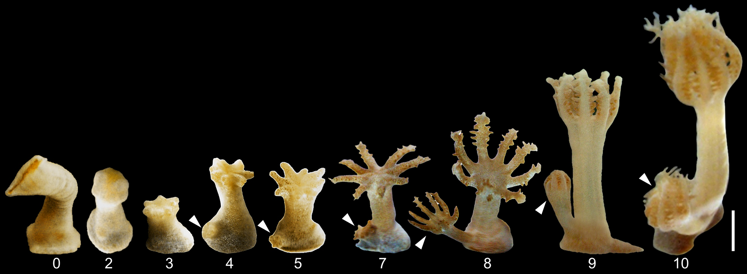 Timeline of oral disc regeneration of amputated polyps of Xenia umbellata from day 0 until regeneration into a fully functional polyp on day 10. Arrowheads indicate developing daughter buds showing similar morphogenesis. Scale bar 1 mm applies to all images.