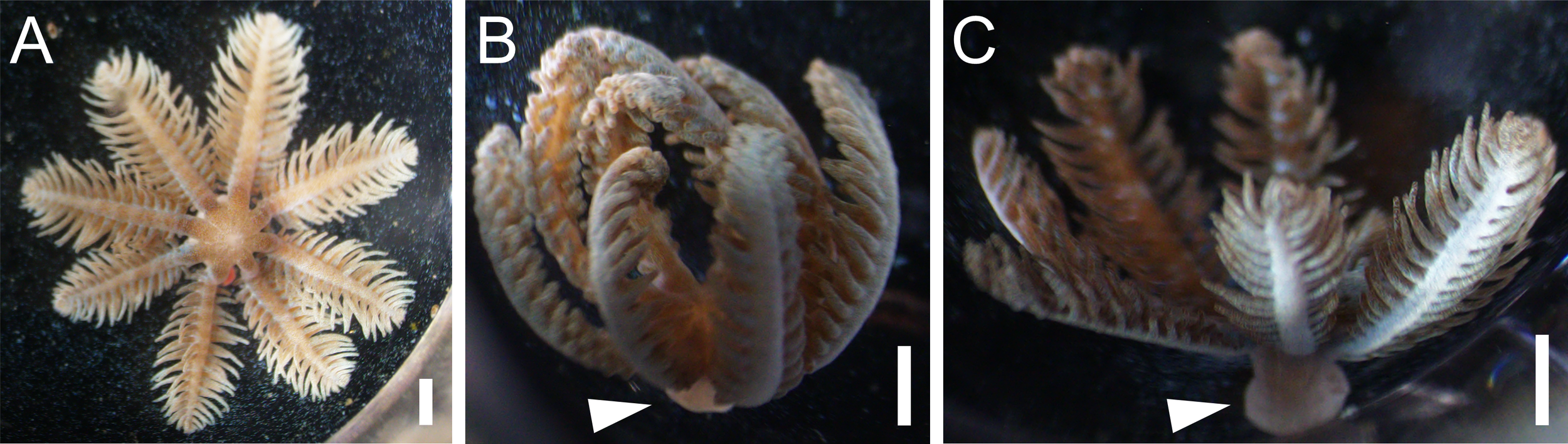 Oral discs at different stages of development of basal attachment disc. (A) Oral disc from amputated polyp, attached but basal disc not yet visible. (B) Oral disc with basal attachment disc forming. (C) Oral disc with fully formed basal attachment disc. Arrowheads indicate basal disc. Scale bars 1 mm.