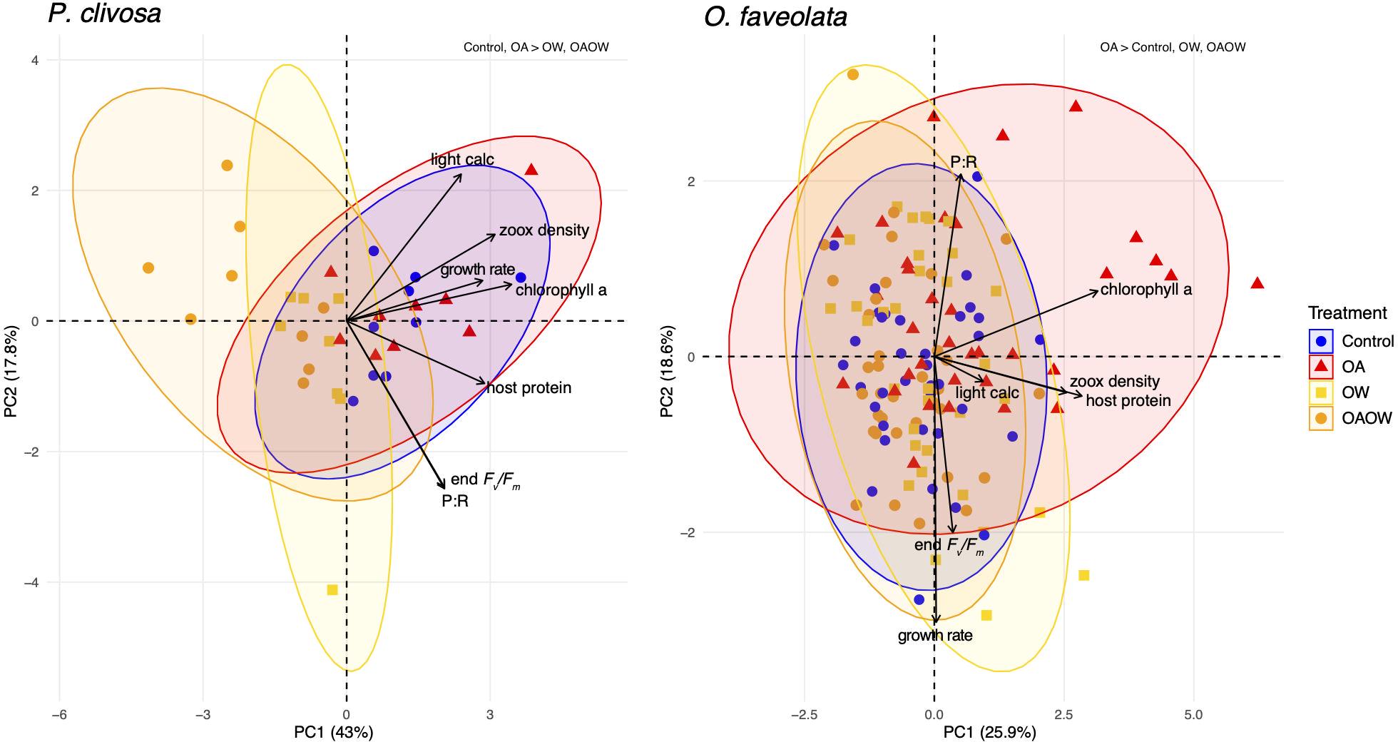 Principal component analysis (PCA) biplot of physiological trait data for 69 P. clivosa (left) and 115 O. faveolata (right) samples. Data point symbols are colored and shaped by treatment. Solid black vectors are trait loadings. PERMANOVA results are displayed in the top right corner of each plot and display differences among treatments.