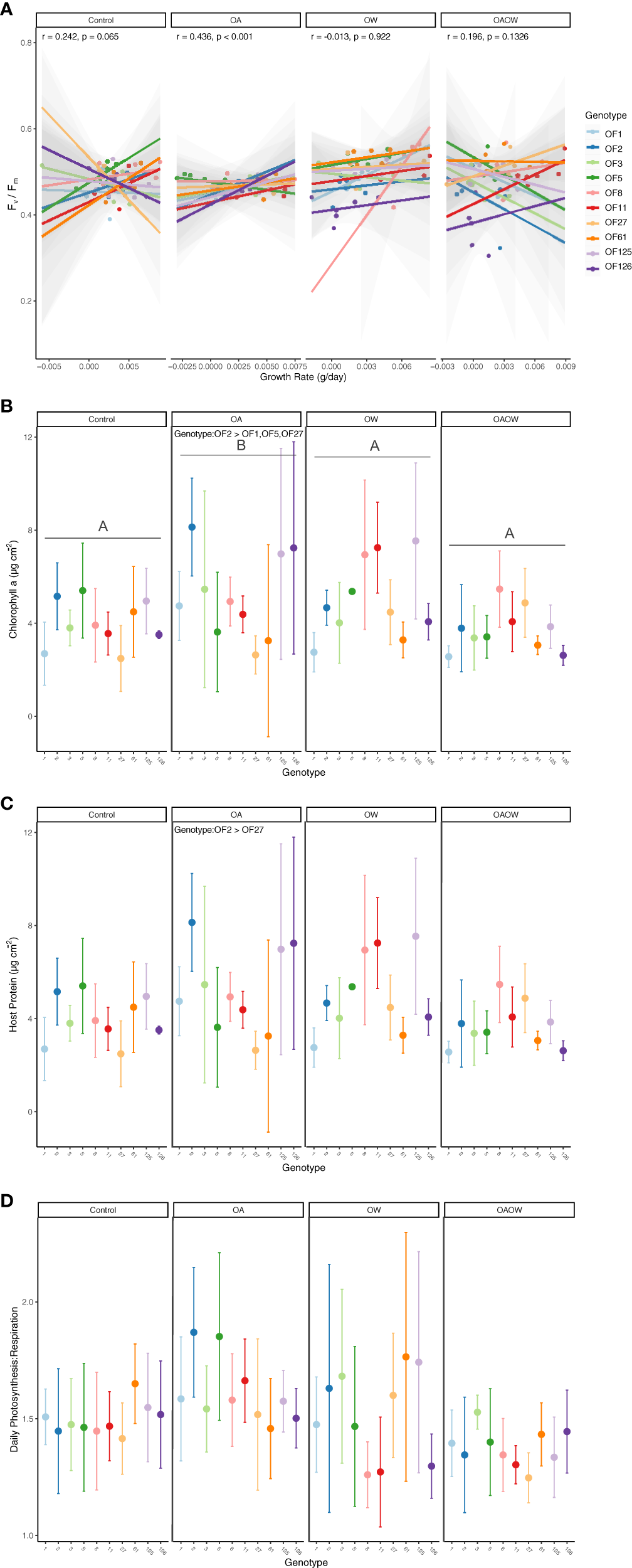 Physiological trait measurements of (A) growth rate correlated with end Fv/Fm, (B) chlorophyll a, (C) host soluble protein, and (D) daily net Photosynthesis: Respiration (P:R) ratio for each genotype of O. faveolata, faceted by treatment (Control, OA, OW, OAOW). Pearson correlation coefficients and p-values are within each treatment for panel (A). Significant pairwise comparisons among treatment are indicated by capital letters in each treatment facet and Tukey HSD significant pairwise comparisons among genotype are specified within treatment, where applicable. Points are colored by genotype and represent mean ± 95% confidence intervals (n=5-6 per treatment).