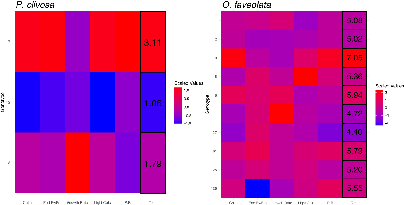 Heatmaps of scaled mean physiological trait values (x-axis) for each genotype (y-axis) of P. clivosa (left) and O. faveolata (right) under the OAOW treatment, where red indicates higher values (= higher performance) and blue are lower values (= lower performance). Values in the ‘Total’ column correspond to the summed average trait values for each genotype.