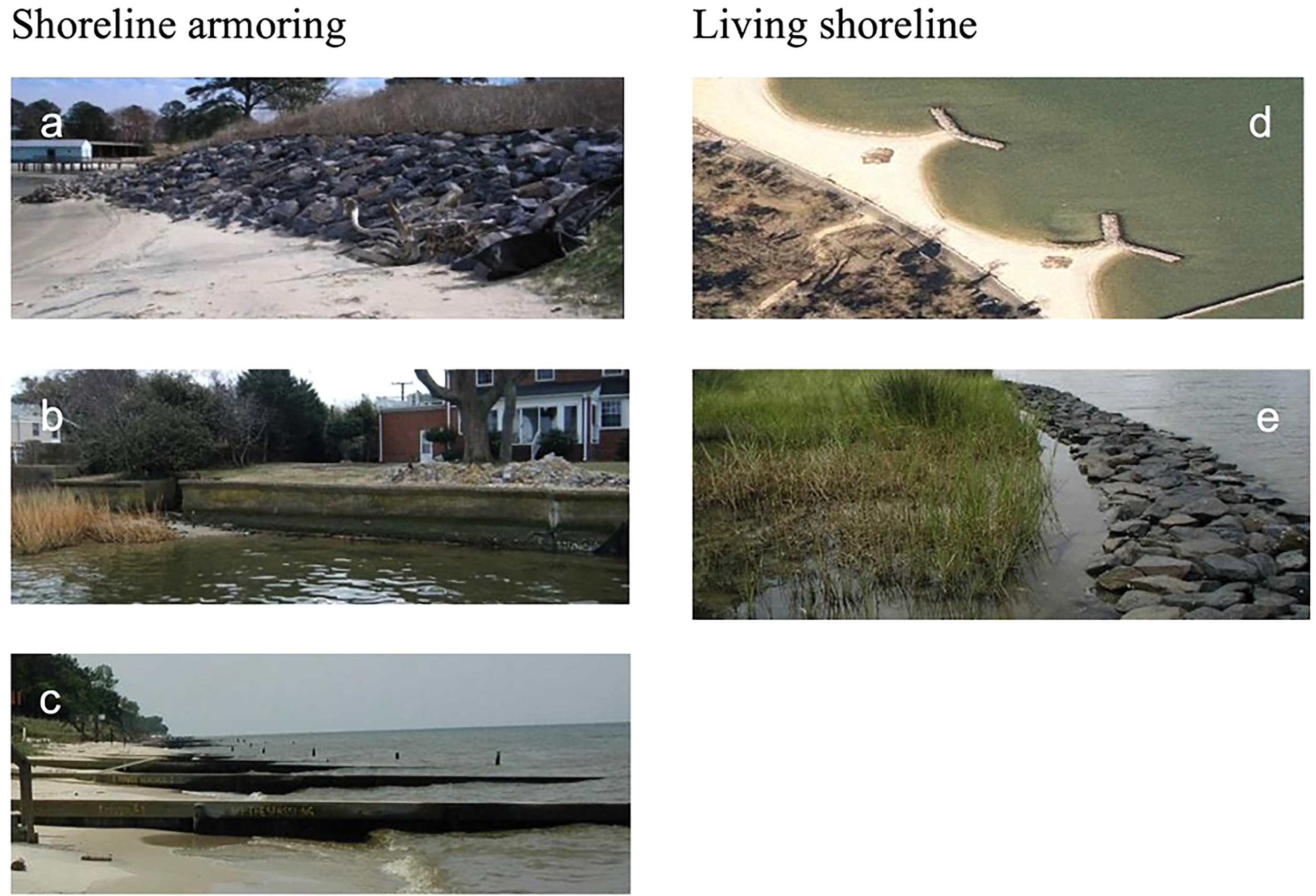 Shoreline modification types Shoreline modification types that were defined in the survey with the accompanying pictures of (A) riprap revetment, (B) bulkhead, (C) groins, which are classified as shoreline armoring and (D) breakwaters, (E) marsh with a rock sill, which are classified as living shorelines. Photo credits from the Center for Coastal Resources Management, Virginia Institute of Marine Science.