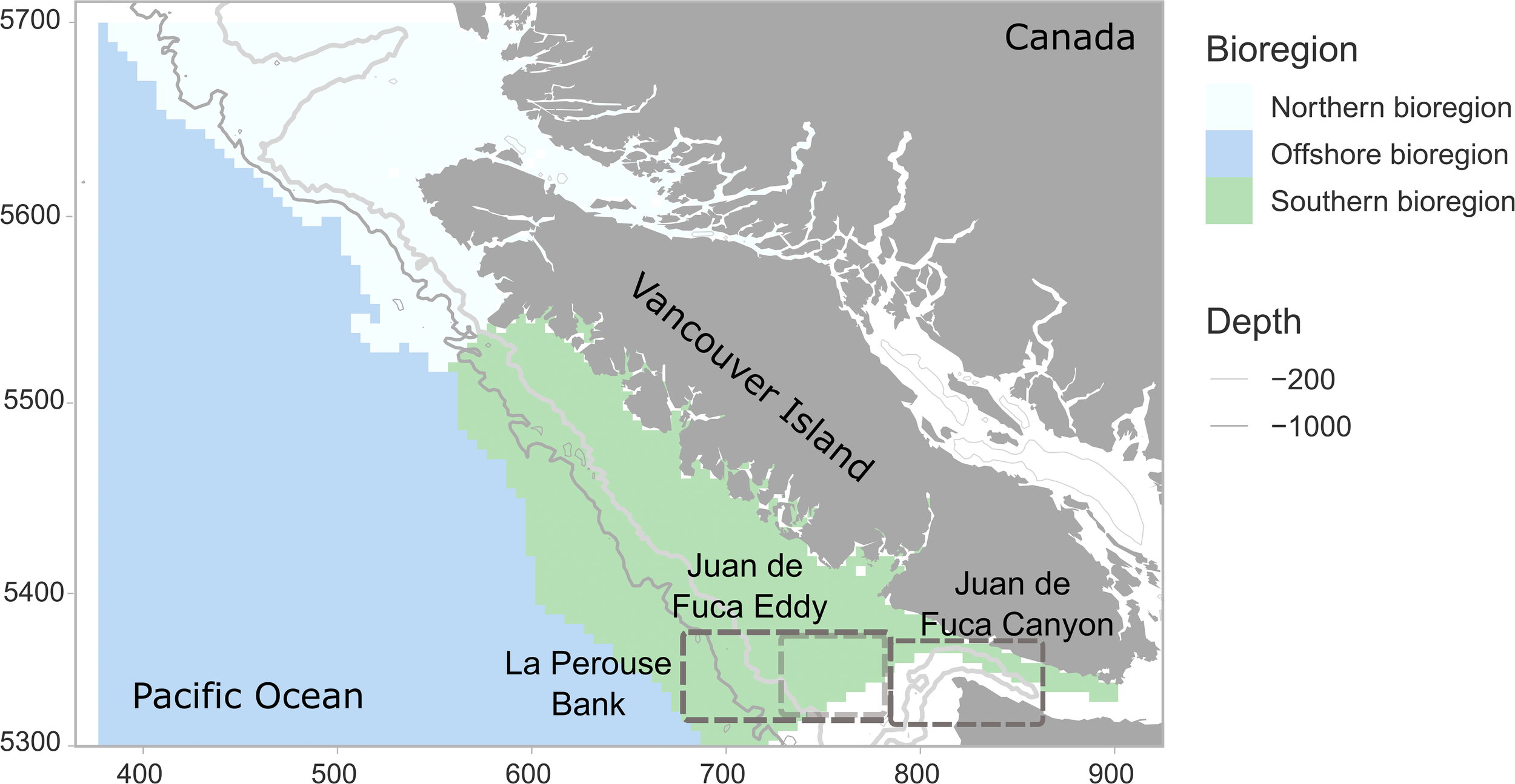 The study area showing boundaries for the southern, northern, and offshore bioregions. Depth contours are shown for 200m and 1000m, indicating the position of the continental shelf and slope and the Juan de Fuca canyon. The location of the La Perouse Bank, the Juan de Fuca Canyon, and the Juan de Fuca Eddy is indicated by grey boxes (the eddy position is shown by a lighter grey box). X and Y axis units are Universal Transverse Mercator in km (UTM - zone 9).