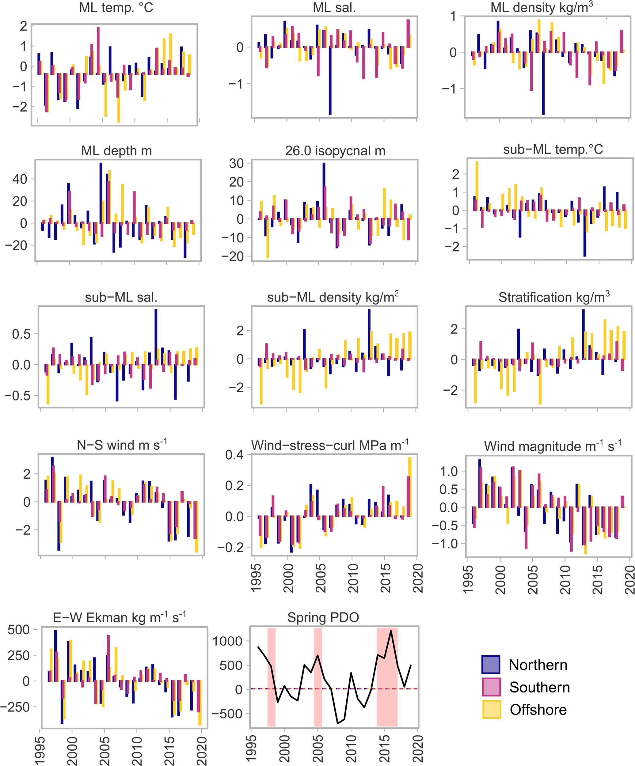 Annual mean anomaly (across stations) for each bioregion, of all variables considered in multivariate and spatiotemporal analysis of ocean-climate conditions. Spring PDO shows the PDO phase during April, May and June of each year - red highlighted regions represent ‘warm’ periods that are mentioned in the text; the 1997 El Niño, the 2005 ‘warm’ event, and the 2014-2016 MHW event. Anomalies were calculated based on the time-series analysed: 1996-2019. ML, mixed layer; temp., temperature °C; sal., salinity; N-S, north-south; E-W, east-west. See Figure 1 for bioregion boundaries.