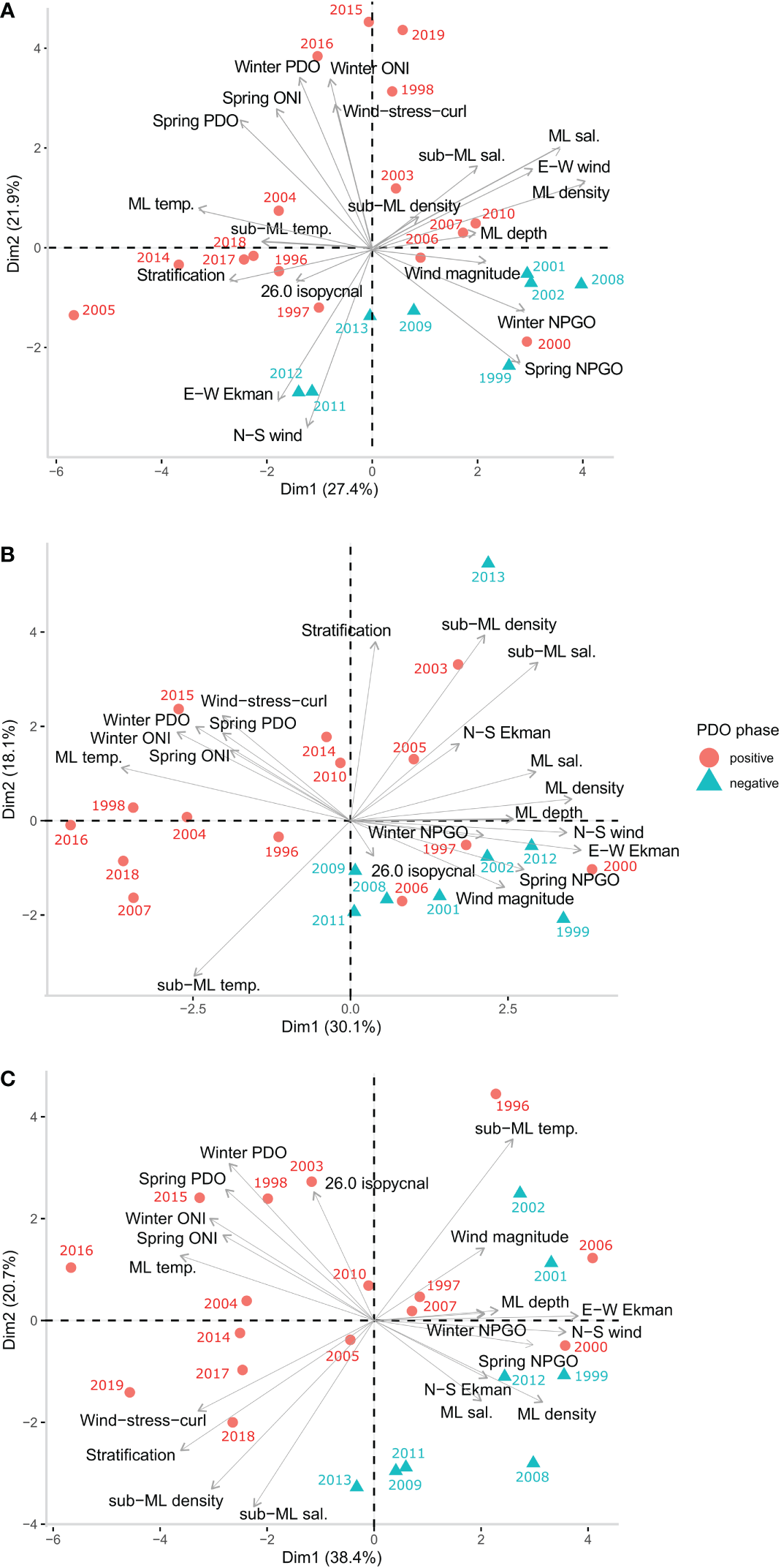 Ordination biplots of PC1 and PC2 for each bioregion, (A) South bioregion, (B) North bioregion and (C) Offshore bioregion. Oceanographic and physical covariates are overlaid as (grey) arrows on top of years (annual means) which are coloured according to PDO phase during April, May and June. ML, mixed layer; temp., temperature °C; sal., salinity; N-S, north-south; E-W, east-west; PDO, pacific decadal oscillation; ONI, Ocean Niño index; NPGO, north pacific gyre oscillation.