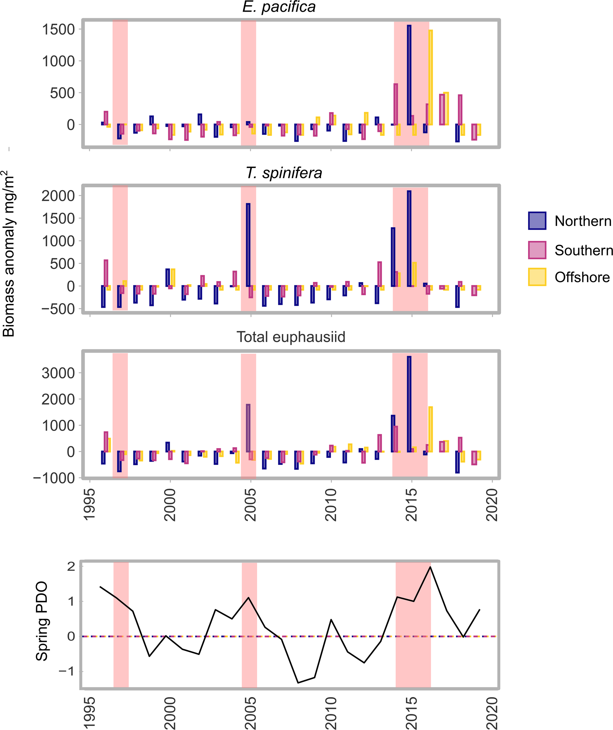 Annual mean anomaly (across stations) of sampled euphausiid biomass for each bioregion. Anomalies were calculated based on the time-series analysed: 1996-2019. Spring PDO shows the PDO phase during April, May and June of each year. Red highlighted regions represent ‘warm’ periods that are mentioned in the text; the 1997 El Niño, the 2005 ‘warm’ event, and the 2014-2016 MHW event.