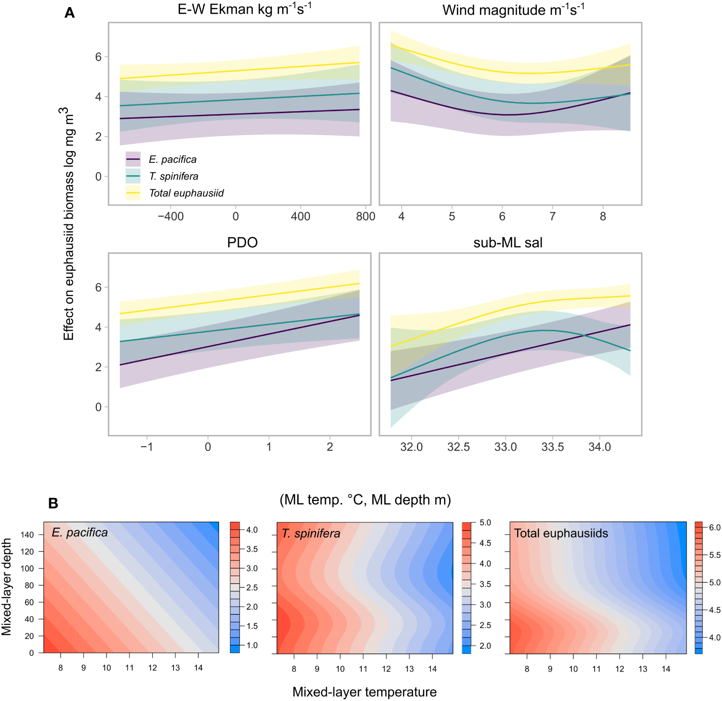 Conditional effects plots for each variable used in spatiotemporal modelling of E. pacifica, T. spinifera, and total euphausiids, with all other variables held at their median. (A). X-axis represented the range of each predictor represented in the model; Y-axis represents the effect on the biomass of each euphausiid group on the link scale (log-link), shaded sections represent +/- 95% confidence interval above and below the estimate of the smooth. (B). The conditional effects of the smooth interaction of mixed-layer temperature and mixed layer depth for euphausiid biomass for each euphausiid model.