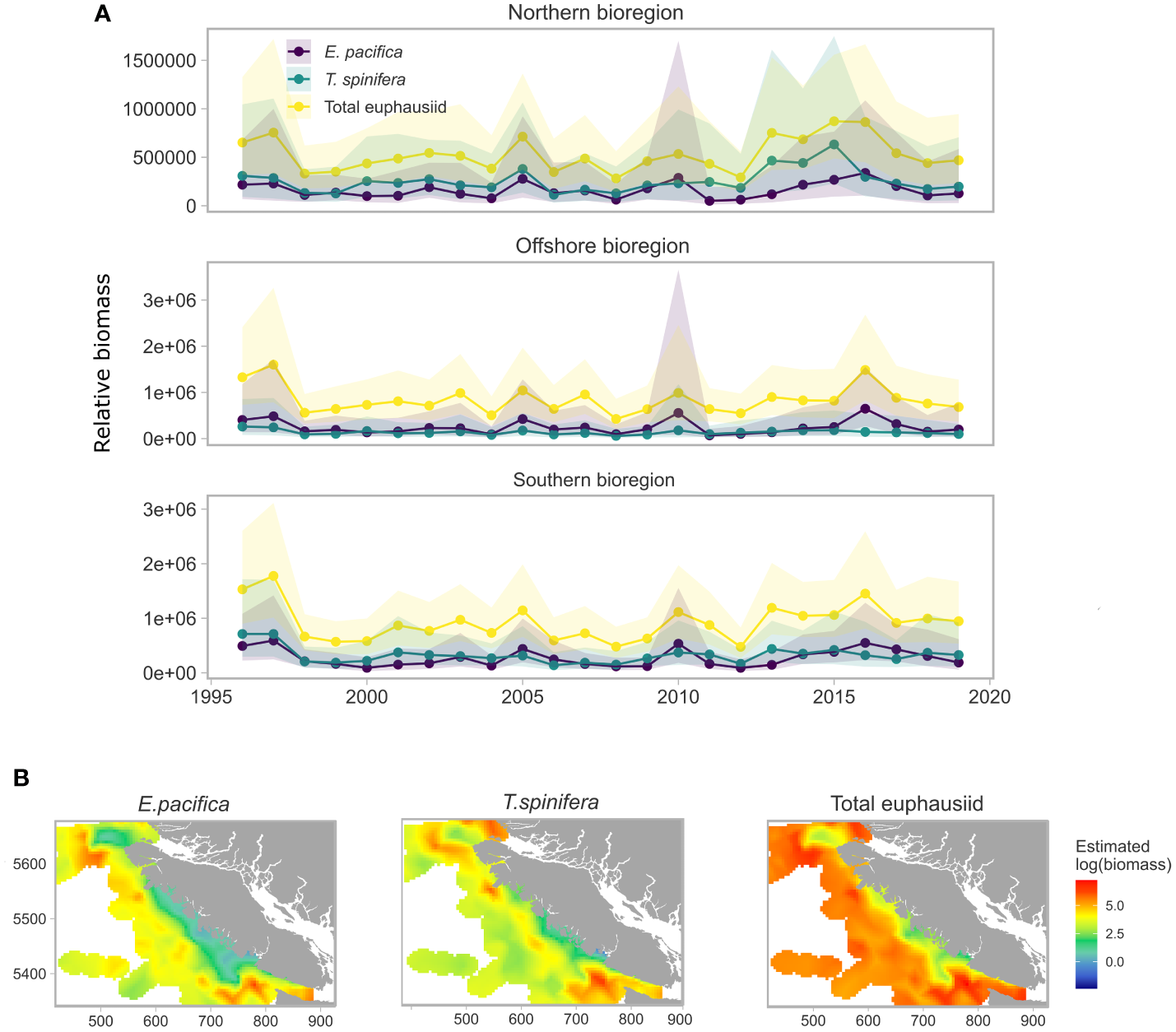 Spatial and temporal means estimated from euphausiid models and predicted on 5km2 covariate grid. (A) Relative mean predicted biomass of E. pacifica, T. spinifera and total euphausiid for each bioregion for each year, (B). Spatial distribution of mean predicted biomass for each of the three euphausiid groups.