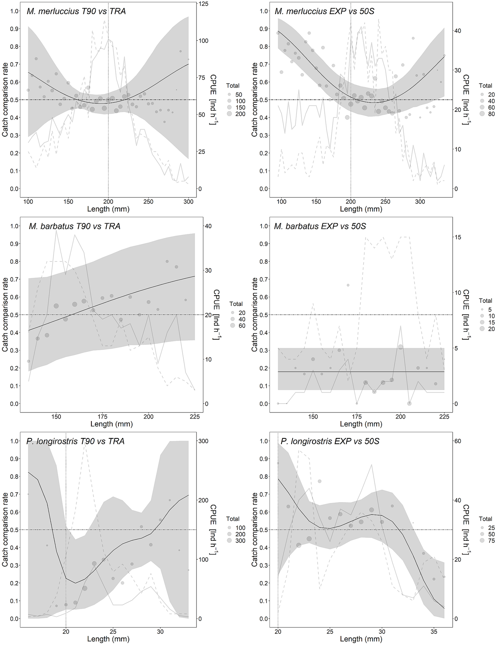 Catch comparison results for Merluccius merluccius, Mullus barbatus and Parapenaeus longirostris between the different net configurations (traditional (TRA), traditional equipped with a 90° turned mesh in the extension (T90), traditional equipped with a 52 mm square meshed codend and a codend cover (52S) and, T90 equipped with a 52 mm square meshed codend (EXP)) equipped with the same codend mesh size. Solid grey line corresponds to the length frequency distribution of the net mounting the T90 extension while the dashed grey line corresponds to the length frequency distribution of the control net (TRA on the left, and 52S on the right). For Merluccius merluccius and Parapeneaus longirostris, the point grey line corresponds to the minimum conservation reference size of the species. The grey area is the confidence interval at 95% of the modelled catch comparison (black solid line). Dots correspond to the individual proportions retained and the size is proportional to the total individual of each size class. The point-dashed horizontal line at 0.5 represents the point at which both gears have equal catch rates.