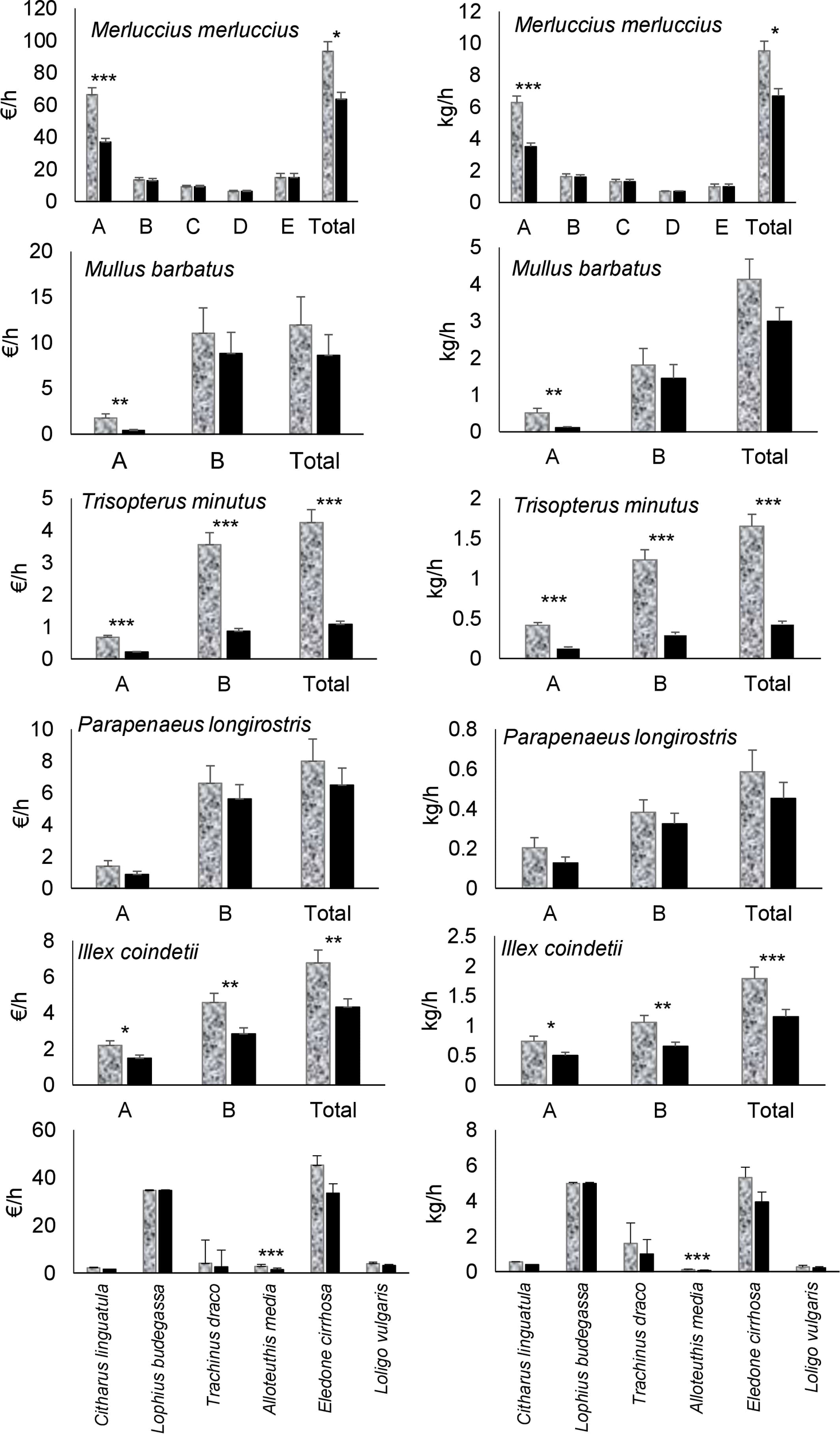 | Merluccius merluccius | n.s. | n.s. | n.s. | n.s. | n.s. | n.s. | *** (6) | *** (6) | *** (6) |