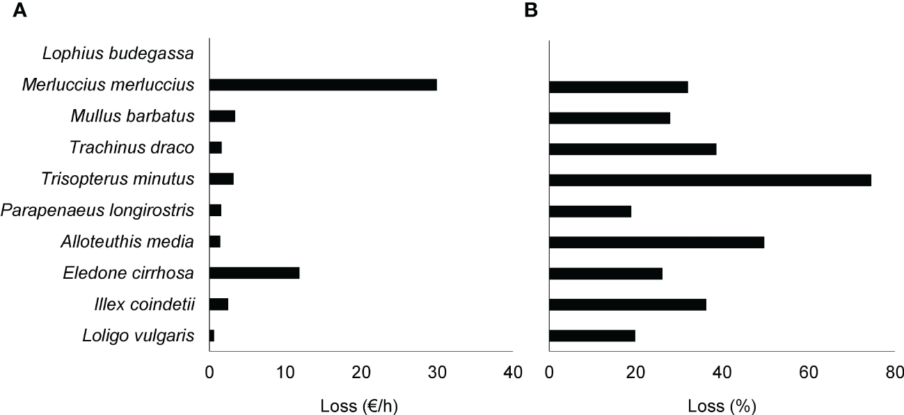 Economic losses (€/h) were calculated as the difference between the theoretical economic yield obtained using 40 mm and 52 mm square meshed codends for every selected species. The percentage that this economic yield loss represented in relation to the economic benefits theoretically obtained using 40 mm square meshed codend was also calculated. This percentage was used to calculate the expectable economic loss resulting by a change from 40 mm to 52 mm square meshed codend in the M. merluccius fishery exploited by the trawl fleet from La Ràpita.