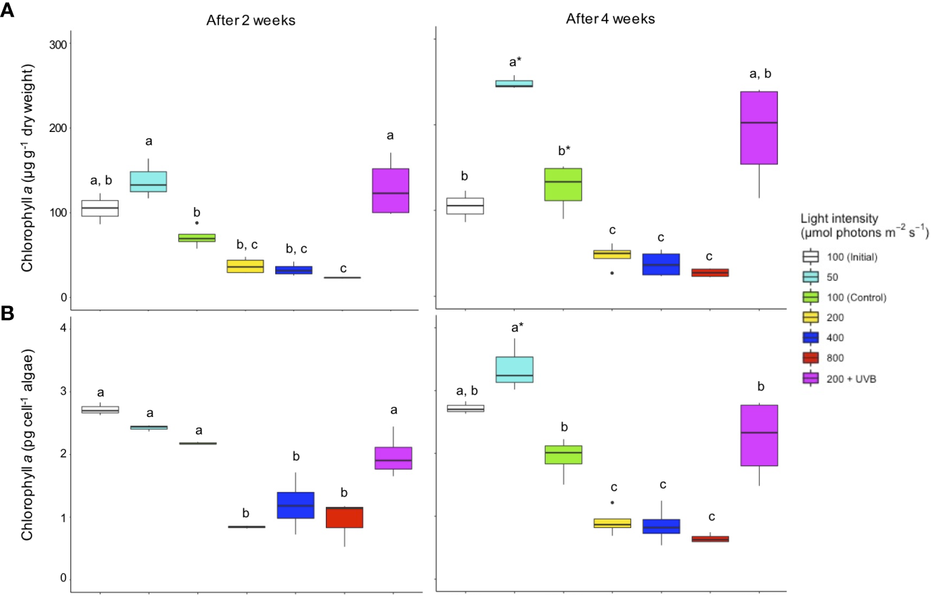 Chlorophyll a concentrations in Cassiopea andromeda specimens treated with different PAR intensities (50–800 µmol photons m-2 s-1) and 200 µmol photons m-2 s-1 + UVB (1.3 KJ m-2 day-1). White boxes show the values upon initial sampling, while colored boxes show the values for these different light treatments after an exposure time of two weeks (left) and four weeks (right). Chlorophyll a concentrations are presented on a (A) per jellyfish dry weight and (B) per endosymbiotic microalgal cell basis. Boxes represent the interquartile range with lowest and highest percentiles (lines), while dots indicate outliers. Lowercase letters indicate significant differences between treatments and asterisk denote significant differences over time (between 2 and 4 weeks) within treatments. Significant differences are based on one-way ANOVAs (n = 4; p< 0.05) followed by Tukey’s HSD test.