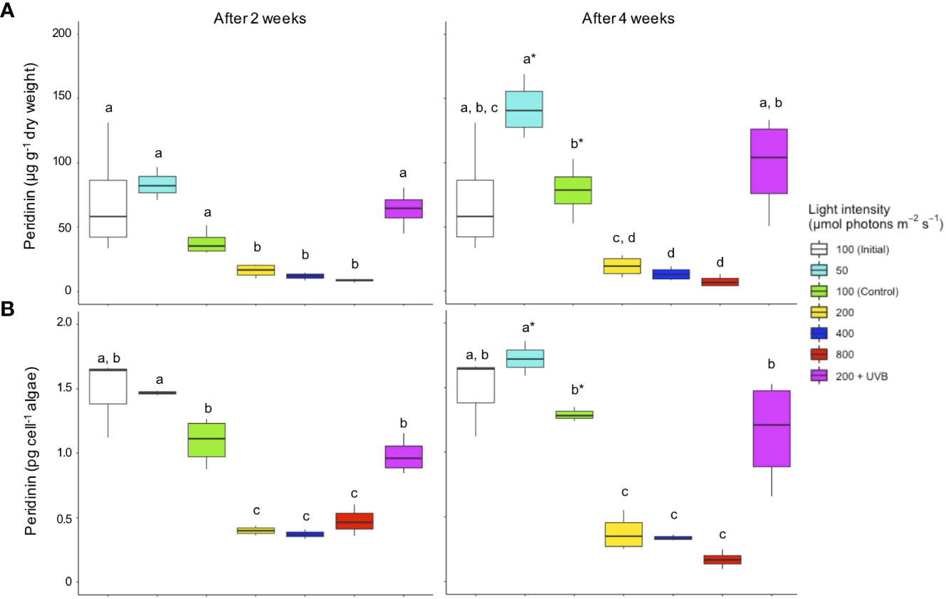 Peridinin concentrations in Cassiopea andromeda specimens treated with different PAR intensities (50–800 µmol photons m-2 s-1) and 200 µmol photons m-2 s-1 + UVB (1.3 KJ m-2 day-1). White boxes show the values upon initial sampling, while colored boxes show the values for the different light treatments after two weeks (left) and four weeks (right) of exposure. Peridinin concentrations are presented on a (A) per jellyfish dry weight and (B) per endosymbiotic microalgae cell basis. Boxes represent the interquartile range with lowest and highest percentiles (lines), while dots indicate outliers. Lowercase letters indicate significant differences between treatments and asterisk denote significant differences over time (between 2 and 4 weeks) within treatments. Significant differences are based on one-way ANOVAs (n = 4; p< 0.05) followed by Tukey’s HSD test.