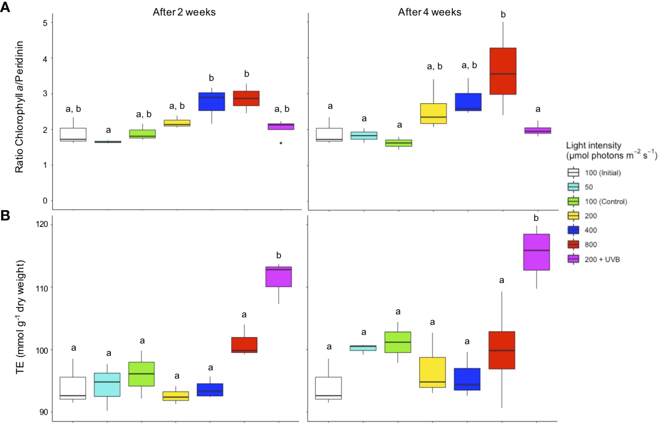 (A) The ratio of chlorophyll a/peridinin based on the concentrations per microalgal cells (pg cell-1) and (B) antioxidant activity expressed in Trolox Equivalents (TE mmol g-1 dry weight) in Cassiopea andromeda treated with different levels of PAR intensity (50–800 µmol photons m-2 s-1) and 200 µmol photons m-2 s-1 + UVB (1.3 KJ m-2 day-1). White boxes show the values upon initial sampling, while colored boxes display the values for the different light treatments after two weeks (left) and four weeks (right) of exposure. Boxes represent interquartile ranges with lowest and highest percentiles (lines), dots indicate outliers. Lowercase letters indicate significant differences between treatments. Significant differences are based on one-way ANOVAs (n = 4; p< 0.05) followed by Tukey’s HSD test.