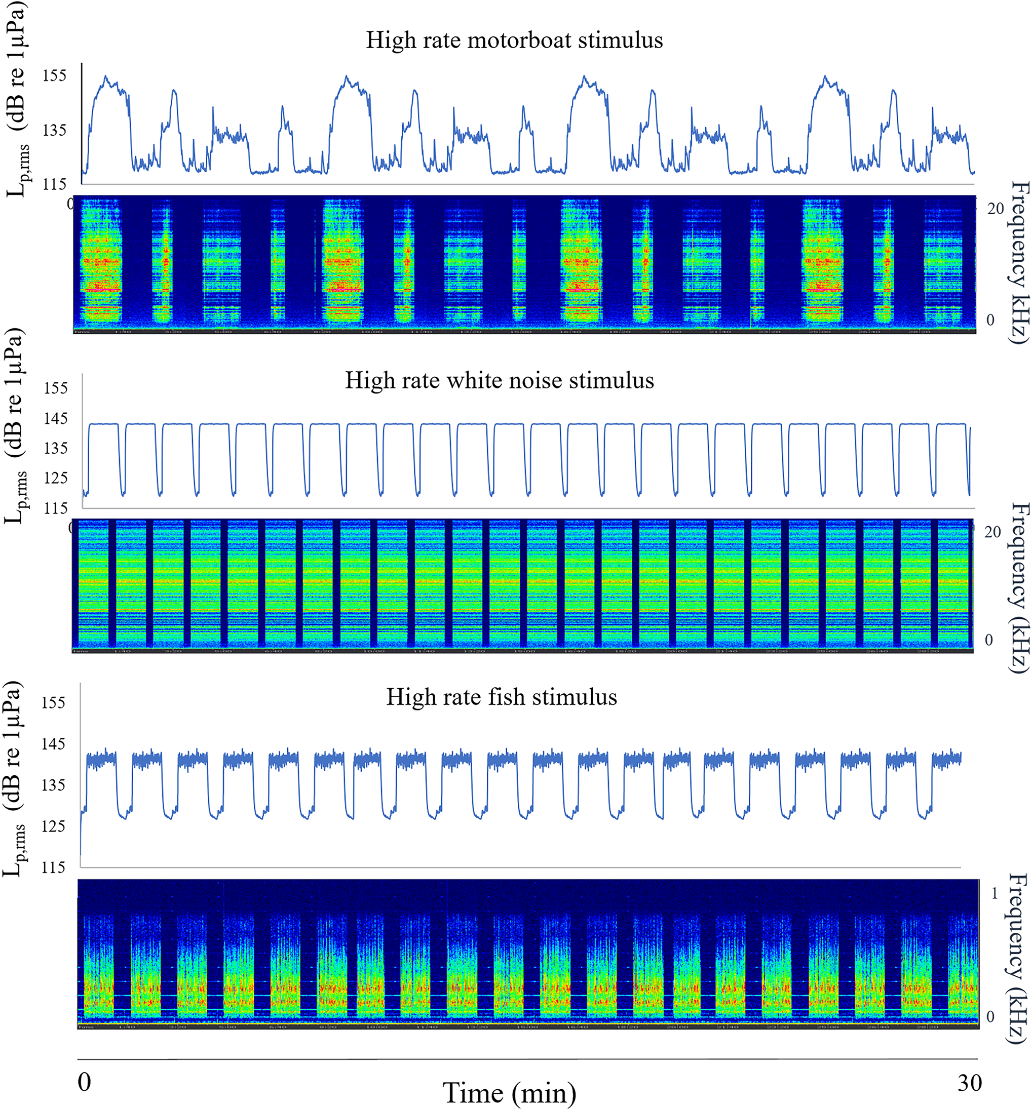 For each stimulus (motorboat, white noise and fish), two patterns of emission were considered: low and high rates. In the high rate pattern, playlists contained 1 min of the sound stimulus + 1 min of silence; while in the low rate one, playlists contained 1 min of the sound stimulus + 5 min of silence. For the stimuli obtained from the habitat (motorboat and fish), both conditions of temporal patterns were selected as proxies of the lagoon mouth soundscape during the warm season: high rate motorboat passes on weekend days while low rate during weekdays; and high rate fish choruses during peak hours (sunset: 19:00 to 21:00 h) while low rate fish choruses in the rest of the day given that these signals showed a strong daily circadian pattern.