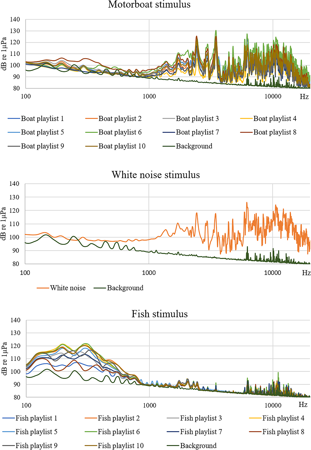 Ten different playlists for each stimulus (motorboat and fish) and pattern of emission (low and high rate) were constructed. A control without sound was used. Thus, six treatments were conducted: (1) low rate motorboat, (2) high rate motorboat, (3) low rate white noise, (4) high rate white noise, (5) low rate fish, (6) high rate fish, and a control without sound.