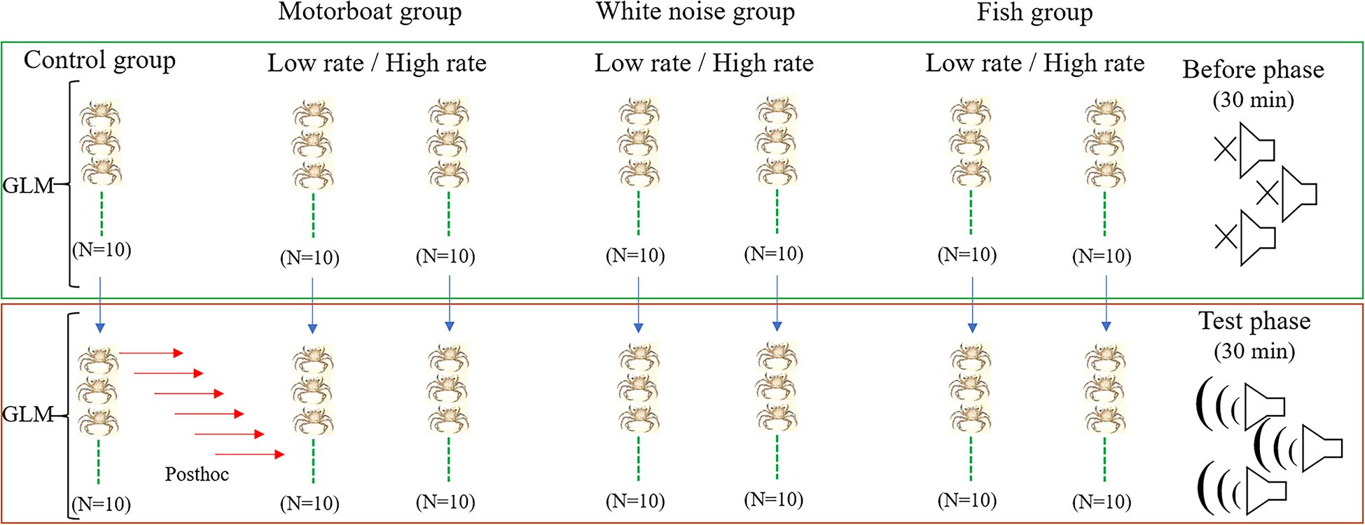 Diagram of the experimental design used showing both phases, before and test, with the control and six levels (low and high rate motorboat, low and high rate white noise, low and high rate fish) in each phase. For each phase, a GLM was performed. In the test phase, the six red arrows represent the posthoc comparisons between the control and levels. The same design was applied for the three behavioral variables (still position, maternal care (flapping + probing) and flapping).