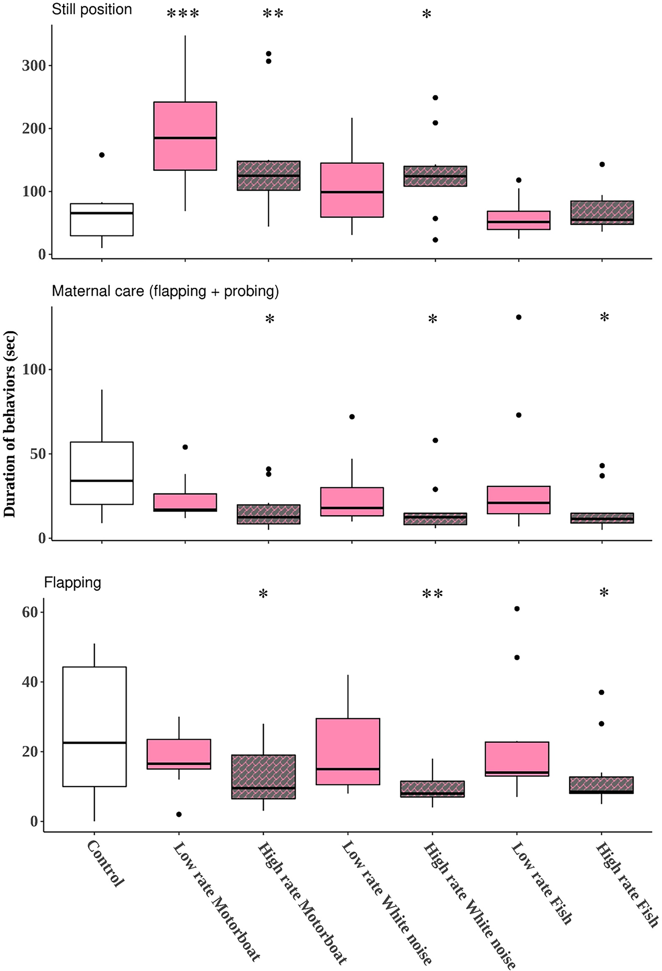 Results of the “test phase” showing the duration (sec) of the behavioral variables quantified: still position, maternal care (flapping + probing), and flapping, for each stimuli and patterns of emission (low rate motorboat, high rate motorboat, low rate white noise, high rate white noise, low rate fish, high rate fish) and the control without sound. High rate temporal emission patterns of the stimuli are represented with grey color, low rate temporal emission patterns of the stimuli with pink color and the control with white color. GLM, significant results: *** P < 0.001, ** P < 0.01, * P < 0.05. The asterisks represent the posthoc comparisons between the control and each treatment for the three behavioral variables.