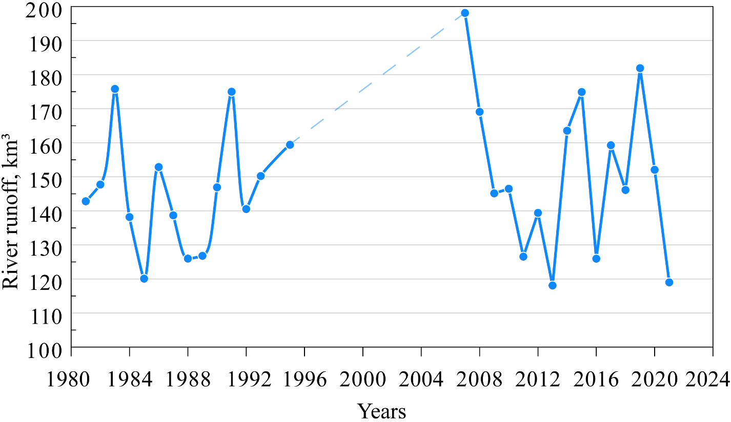 Inter-annual variability of the Pechora River runoff in 1981-1995 and 2006-2021.