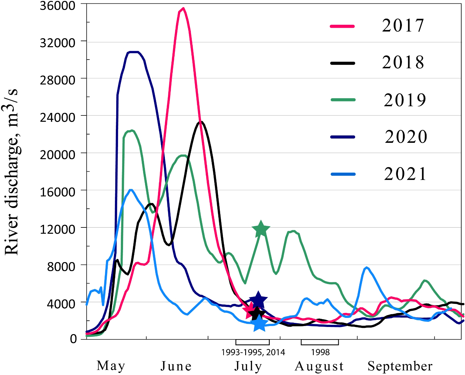 Daily variability of the Pechora River discharge during ice-free period in 2017-2021. Periods of surveys in 2017-2021 are indicated by color stars. Periods of surveys in 1993-1995, 1998 and 2014 are indicated by black rectangles on the bottom axis.