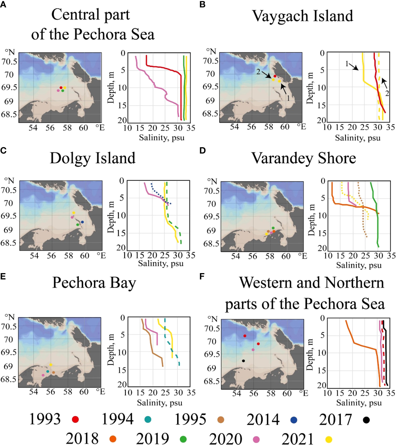 Typical vertical salinity structure in the central part of Pechora Sea (A), near Vaygach Island (B), Dolgy Island (C), Varandey shore (D), in the Pechora Bay (E), western and northern parts of the Pechora Sea (F) in July-August 1993-1995, 2014, 2017-2021. We used two types of lines (dashed and dotted) for better visibility in case of overlapping stations or matching colors.