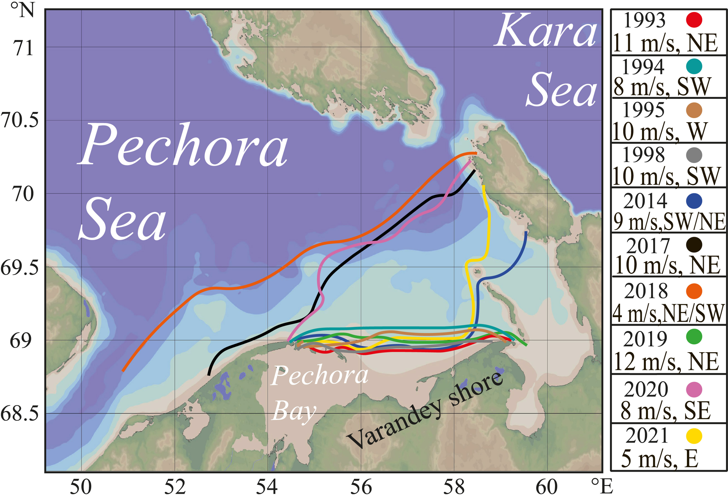 Based on salinity measurements and satellite data, we reconstructed location of the isohaline of 25 in the surface layer during 10 oceanographic surveys in 1993-2021 (Figure 7). Among them, only several oceanographic surveys covered the entire study area at the Pechora Sea, while the majority of surveys were focused on certain parts of this area. Due to this fact, locations of the plume boundary were reconstructed from satellite thermal data verified by synchronous in situ measurements. We presume that the reconstructed plume areas represent the plume during the periods of the surveys. Also in Figure 7 we show average wind forcing conditions during the periods of field surveys.