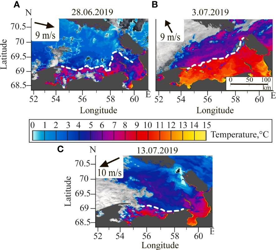 Satellite-derived sea surface temperature in the Pechora Sea on 28 June (A), 3 July (B), 13 July (C) 2019 acquired by MODIS Terra/Aqua. Locations of the Pechora plume border is indicated by white dashed lines. Dark grey color indicates land, white color indicates cloud coverage of the study area. Wind directions and velocities averaged during two days preceding the satellite image are shown in the insets.