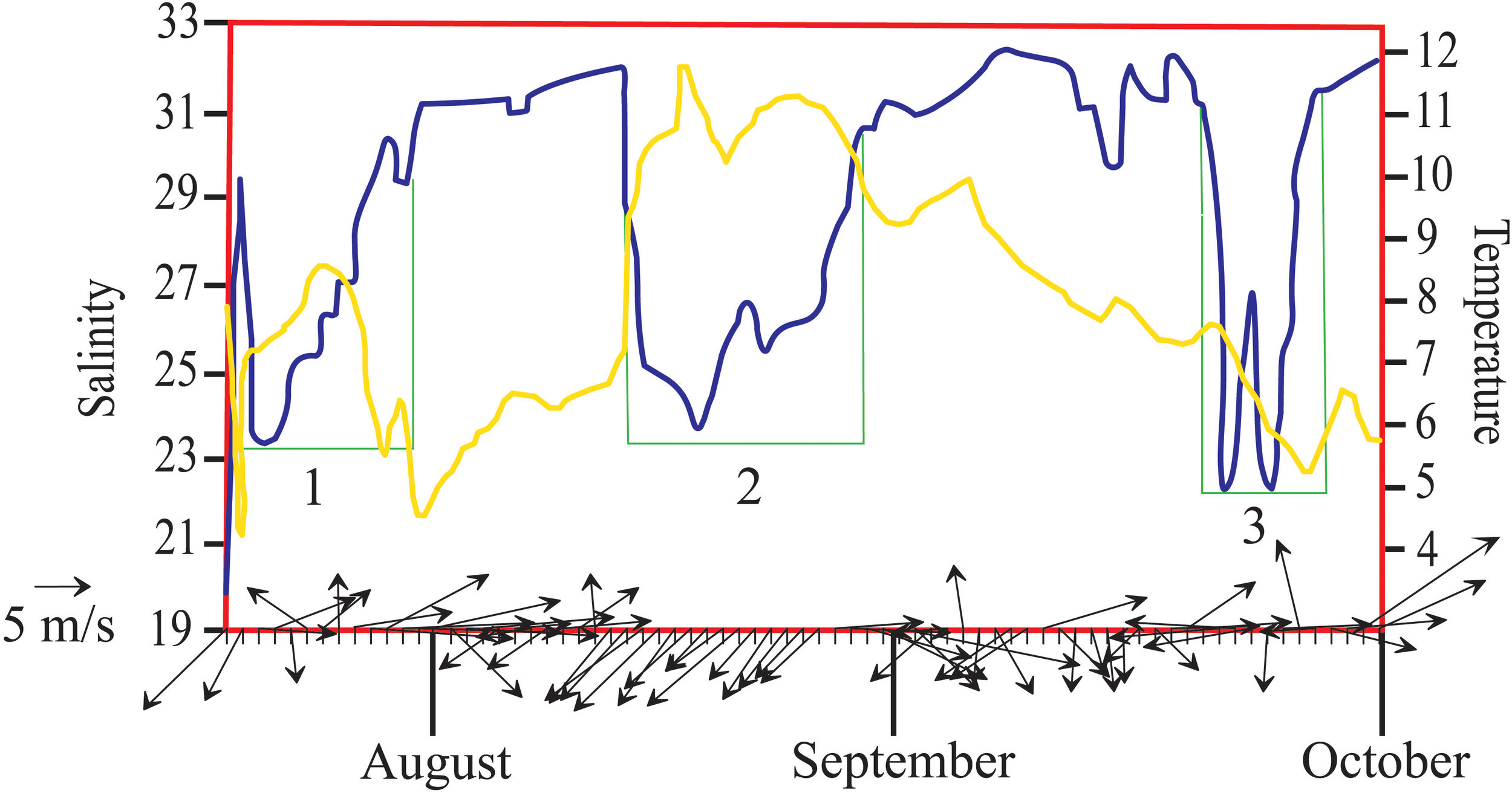 Daily temperature (yellow line) and salinity (blue line) measurements in the surface layer on 20 July – 1 October 2002 and the accompanying wind forcing conditions in the Pechora Sea (arrows). Three periods of reduced salinity are indicated by green lines and numbers.