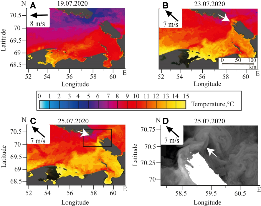 Satellite-derived Sea surface temperature in the Pechora Sea on 19 July (A), 23 July (B), 25 July (C, D) 2020 acquired by NOAA-20/VIIRS (A-C) and Landsat-8 (D). Inflows of the Pechora plume to the Kara Sea through the Kara Strait are indicated by white arrows. Black rectangle in panel (C) indicates location of the zoomed area shown in panel (D). Dark grey color at panels (A-C) and white color at panel (D) indicate land; white color at panels (A-C) indicates cloud coverage of the study area. Wind direction and velocity averaged during two days preceding the satellite image are shown in the insets.