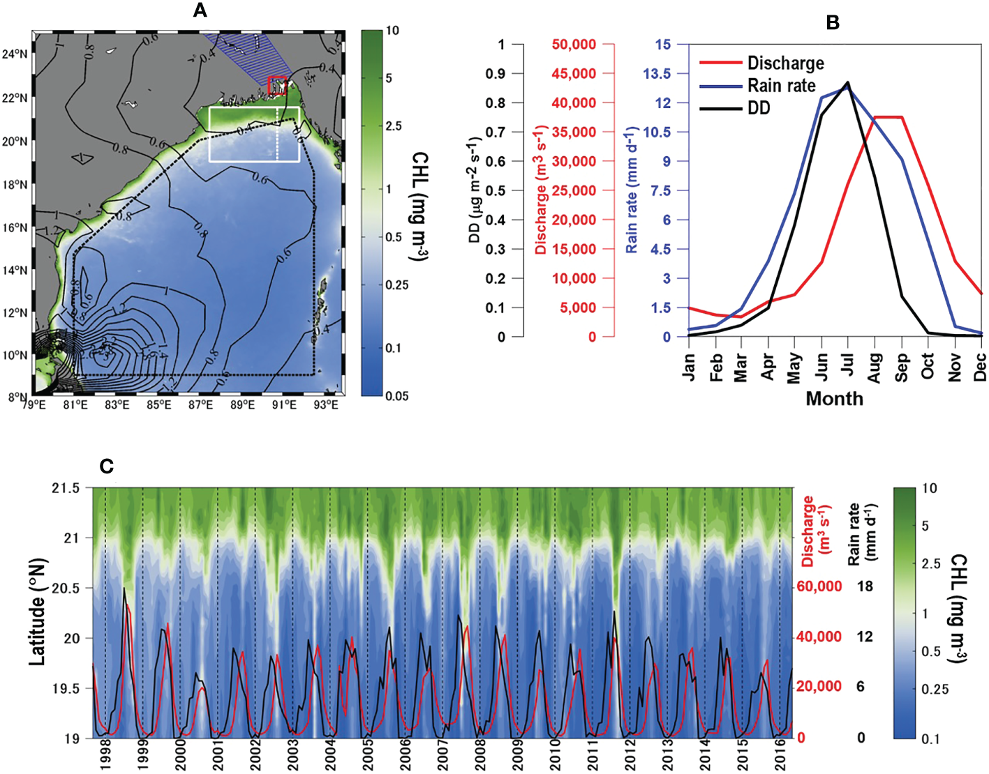 (A) Annual means of satellite-derived CHL (shaded map) overlaid by the SPRINTARS-modeled DD (contour map). The red square indicates the approximate position of the mouth of the GBR. The white rectangle adjacent to the north coast of the bay is the area where CHL was averaged zonally (east-west direction, log scale), and its meridional time series is presented in (C). The red and black solid lines in (C) are time series of GBR discharge and rainfall, respectively. The north-south dashed white line (inside the white box (A) in front of the river mouth) is a transect line where CHL, CHL anomaly, and normalized water-leaving radiance at a wavelength of 555 nm (nLw555) were extracted and are presented in Figures 2A–C. (B) Monthly climatological means of DD (black line), rain rate (blue line), and GBR discharge (red line). The DD data were extracted from the region of the BoB bounded by a dashed black polygon in (A). Rainfall data were extracted from the blue hatched polygon in (A), which was part of the catchment area of the GBR.
